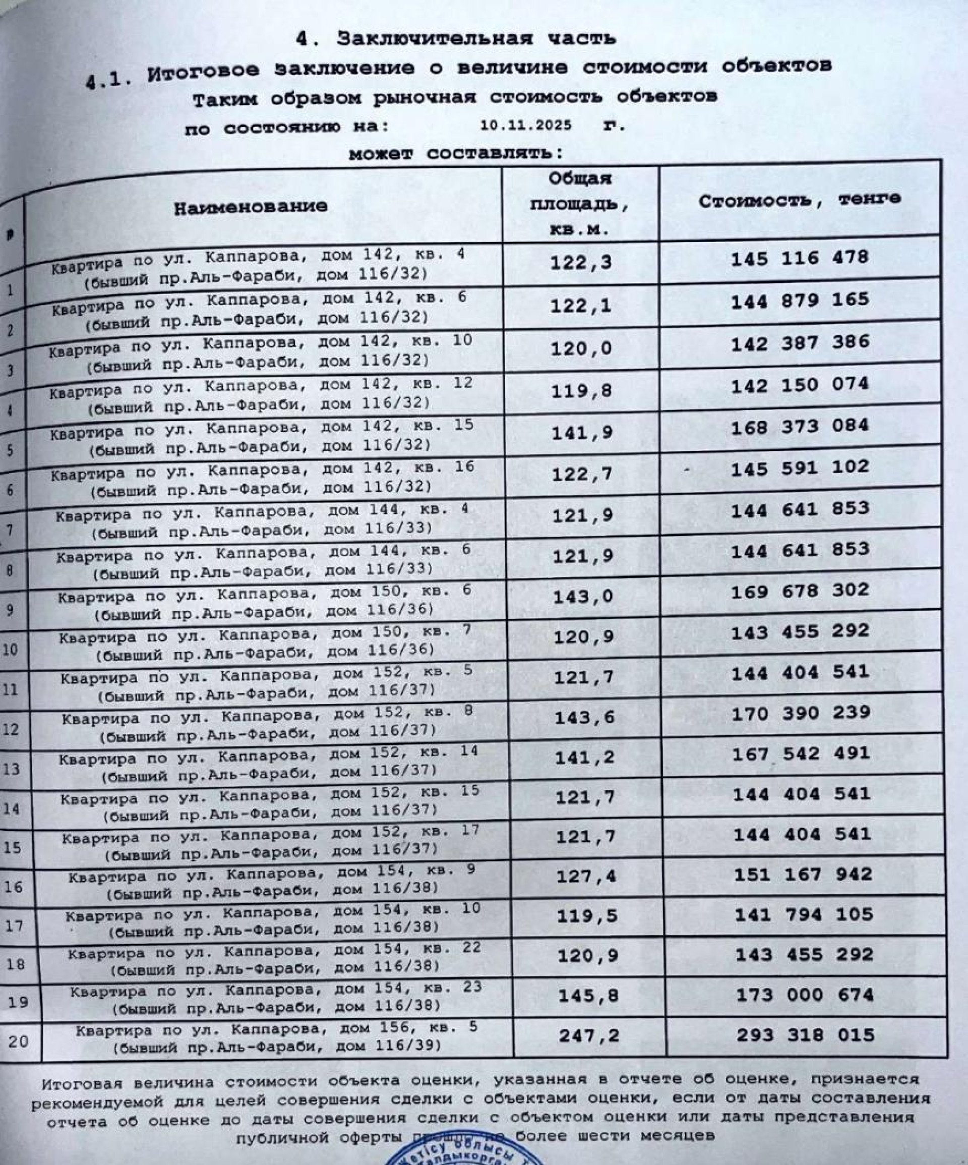 В том же отчёте об оценке бывшего массажного салона указано, что Департамент госимущества Алматы заказал оценку всего 23 объектов недвижимости. И это без учёта квартир в Esentai City, которые оценивались по другому договору.
