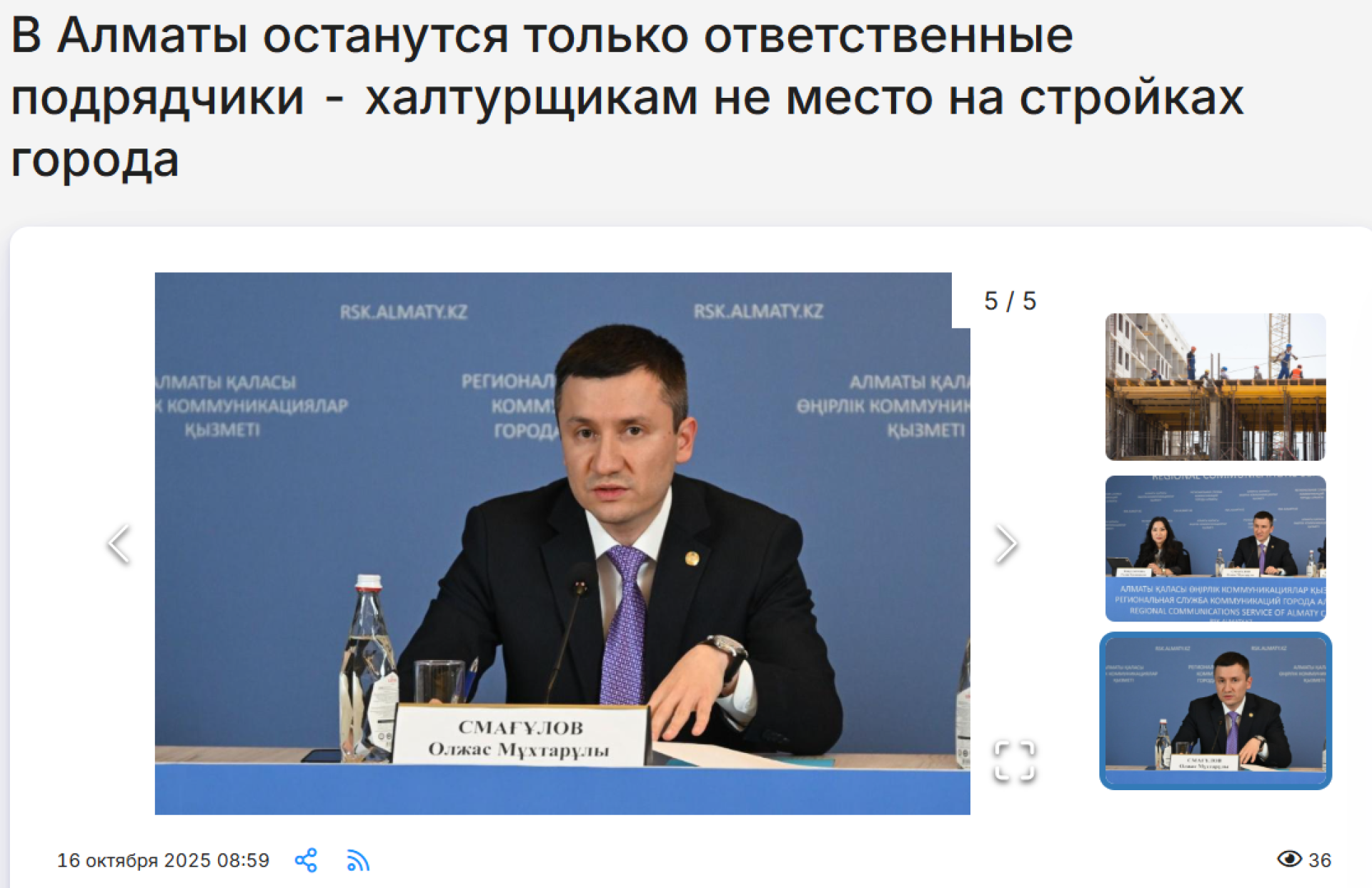 "В Алматы должны работать только добросовестные подрядчики. Те, кто пришёл похалтурить и заработать лёгкие деньги, — у них это не получится. Мы поддерживаем честный бизнес, но к нарушителям будем применять самые строгие меры".