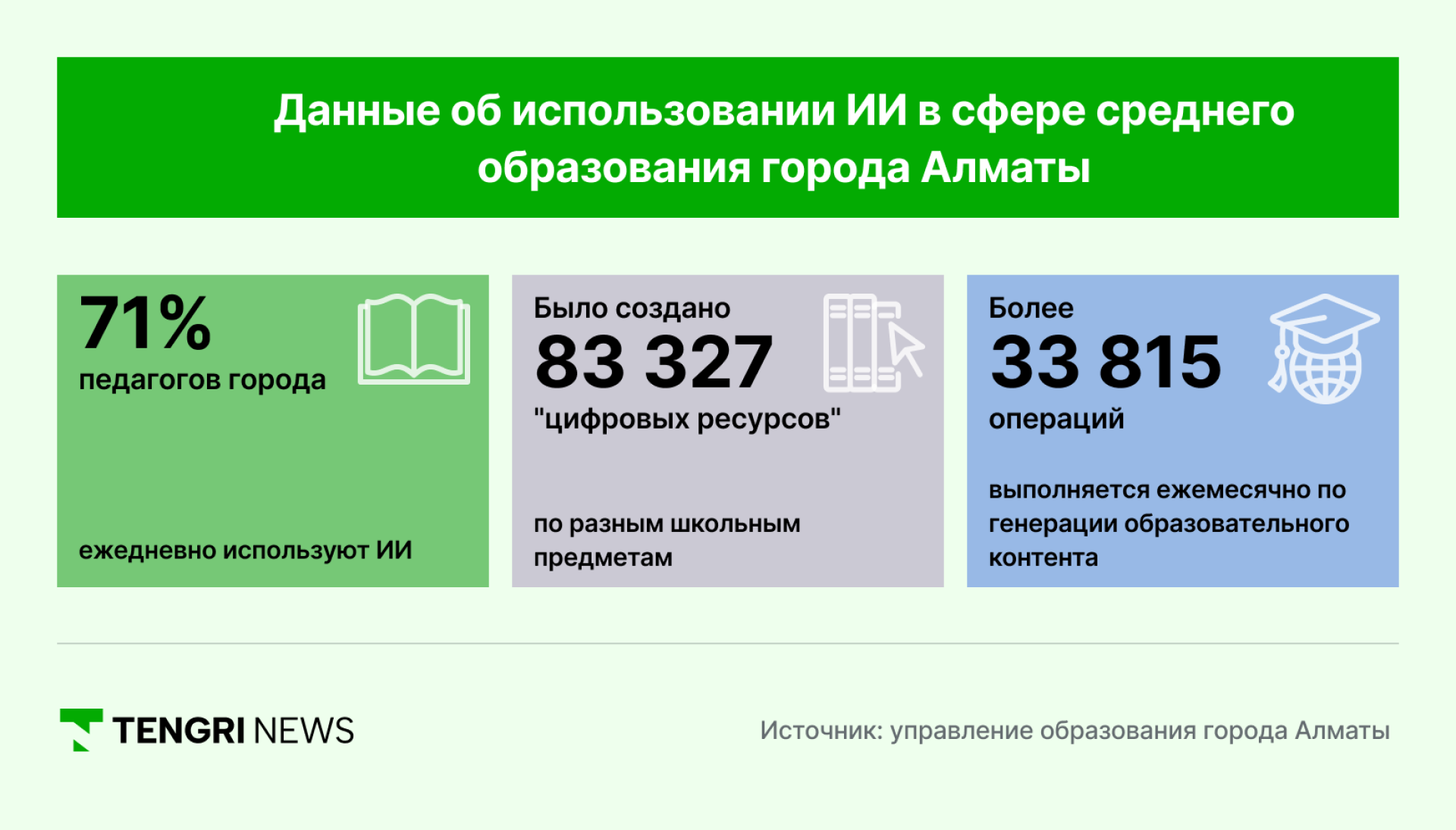 В связи с этим мы захотели выяснить у управления образования Алматы, какая ещё работа проводится в этом направлении. Как нам сообщили в ответе на официальный запрос, на начало 2026 года доступ к ИИ-инструментам обеспечен более чем для 200 тысяч пользователей: