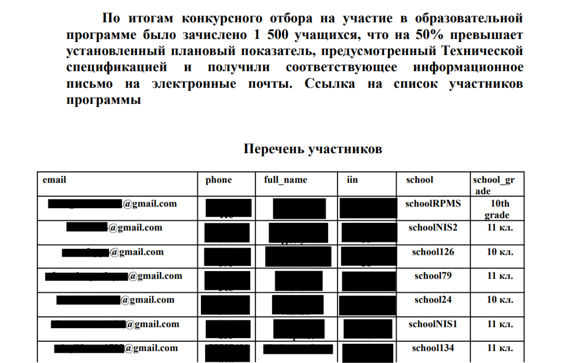 В список попали их имена и фамилии, электронная почта, номер телефона, ИИН, номера школ и классов: