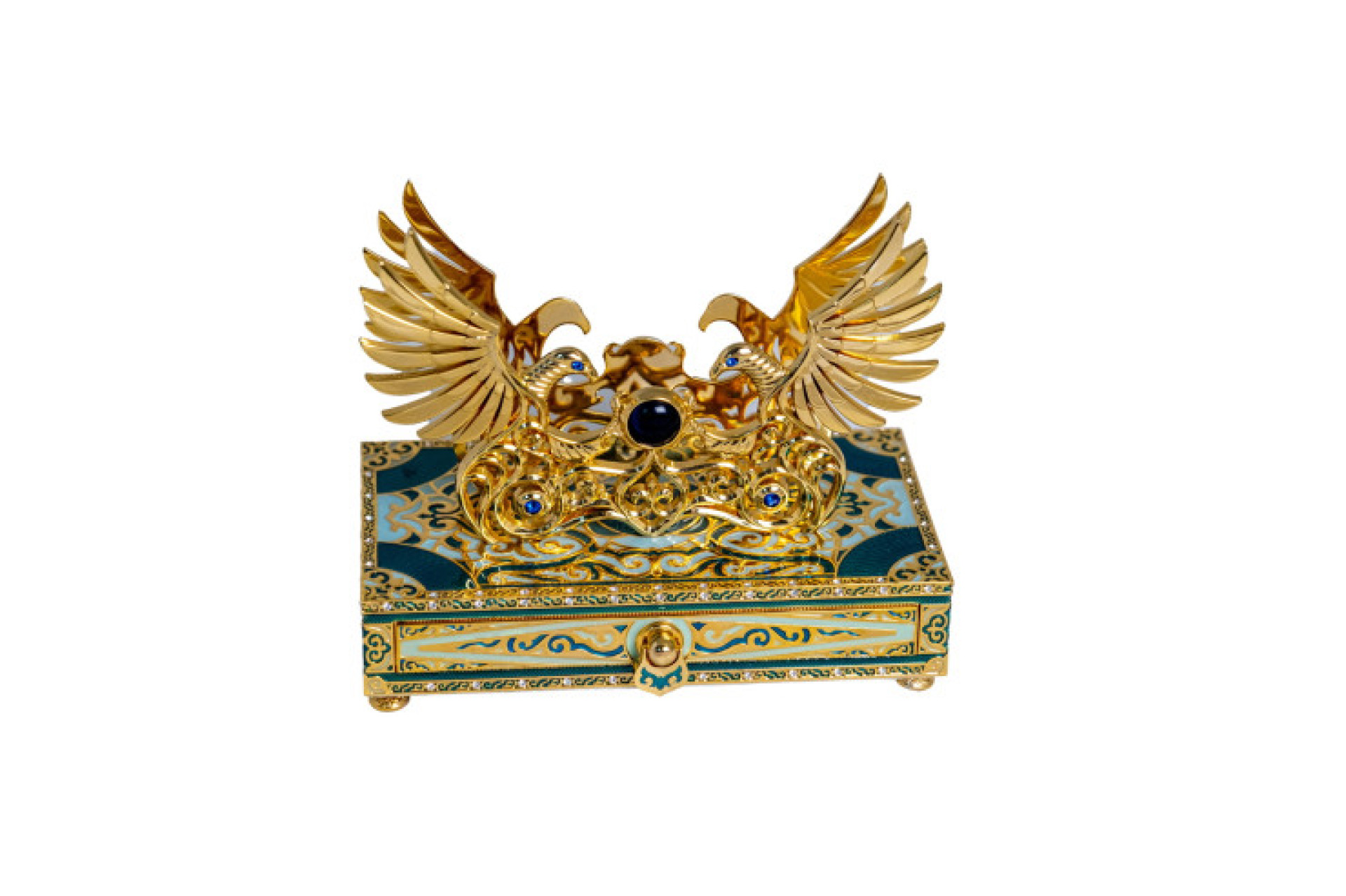 "На настольном наборе располагаются два орла, расправившие крылья. На их глазах установлены камни Swarovski голубого цвета. Орлы когтями держатся за камень кошачий глаз диаметром 1,8 сантиметра. Основа шкатулки выполнена из золотистого металла с орнаментами из полупрозрачной цветной эмали, изумрудных и фисташковых цветов. По краям шкатулки — камни Swarovski".