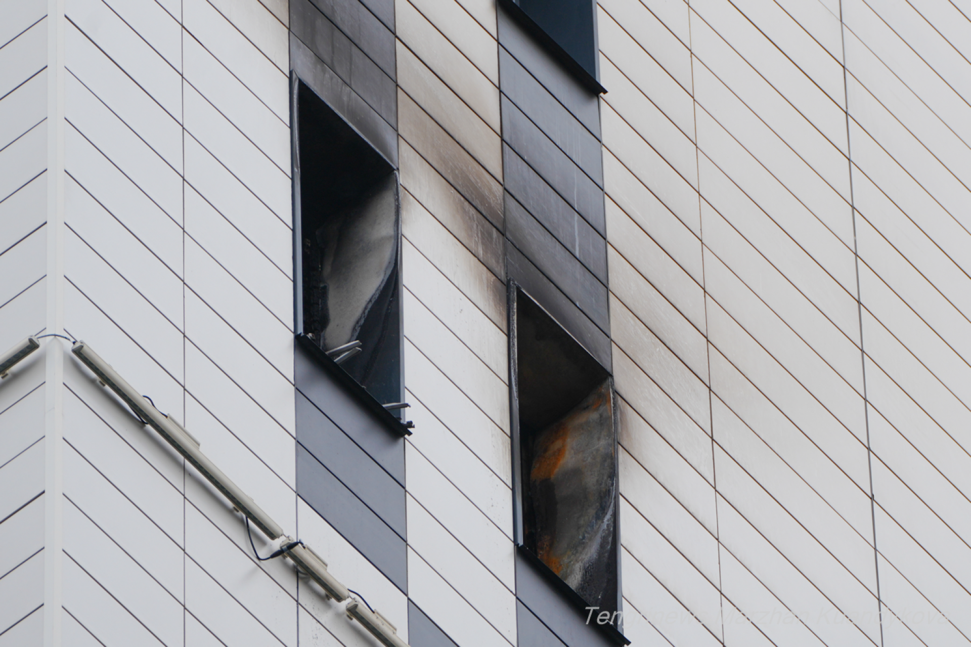 С улицы квартиру, где произошла трагедия, видно сразу — по обгоревшим окнам и почерневшему фасаду вокруг. Чёрные пятна на светлой обшивке не перепутаешь ни с чем.