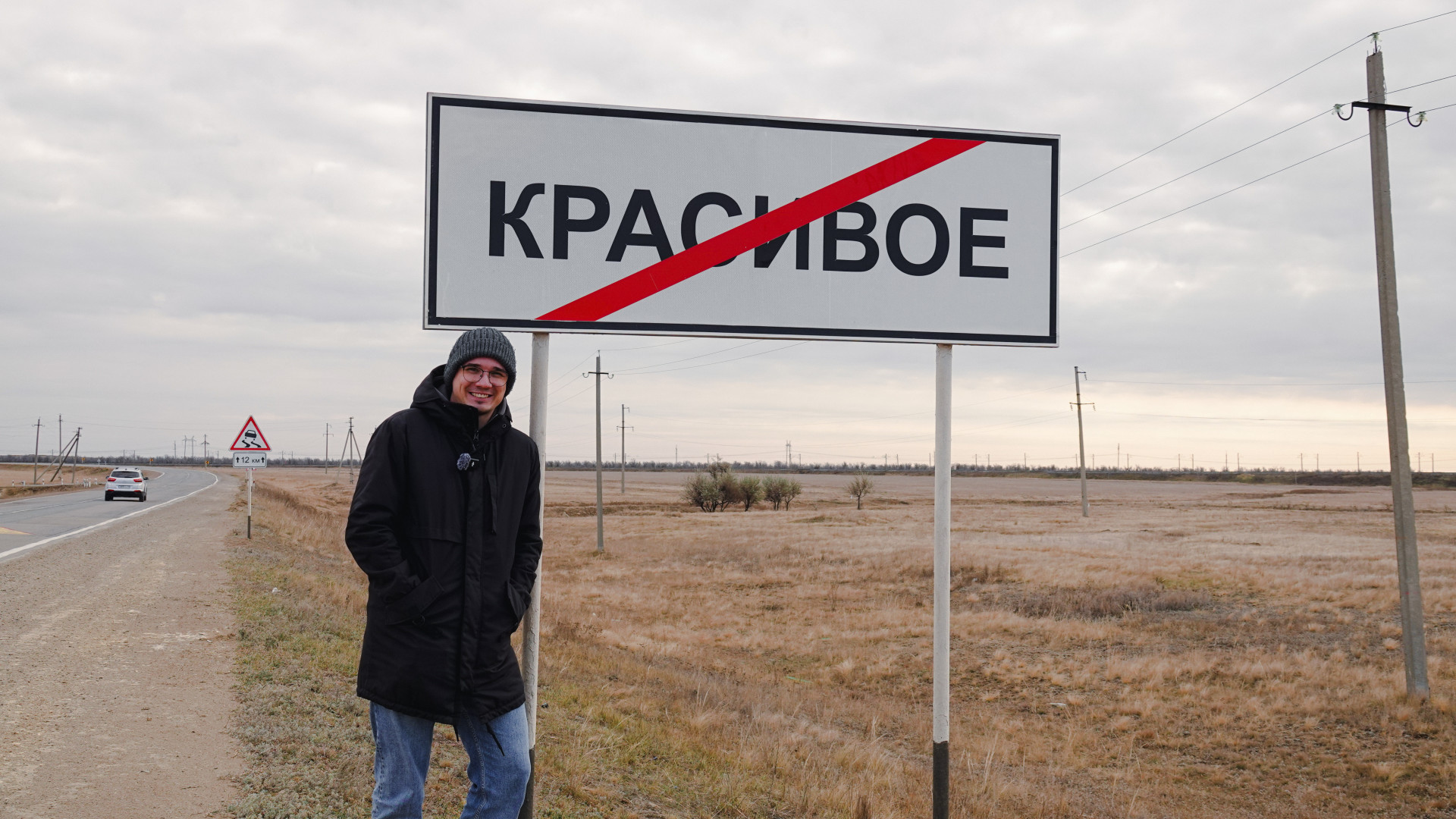 Автор этого текста Иван Сухоруков на фоне таблички с названием села. Фото: ©️ Tengrinews.kz / Алимжан Аманжол