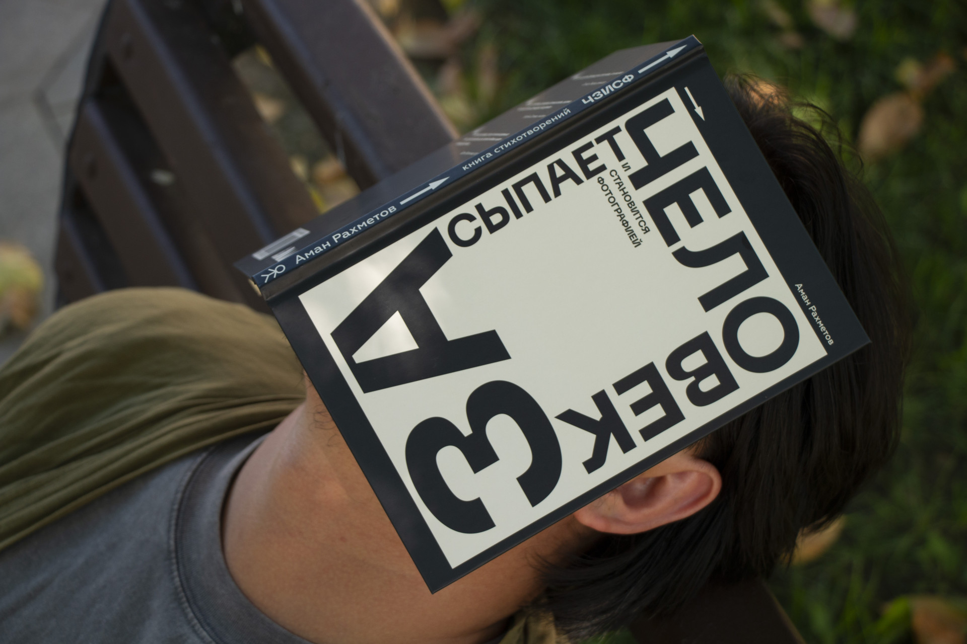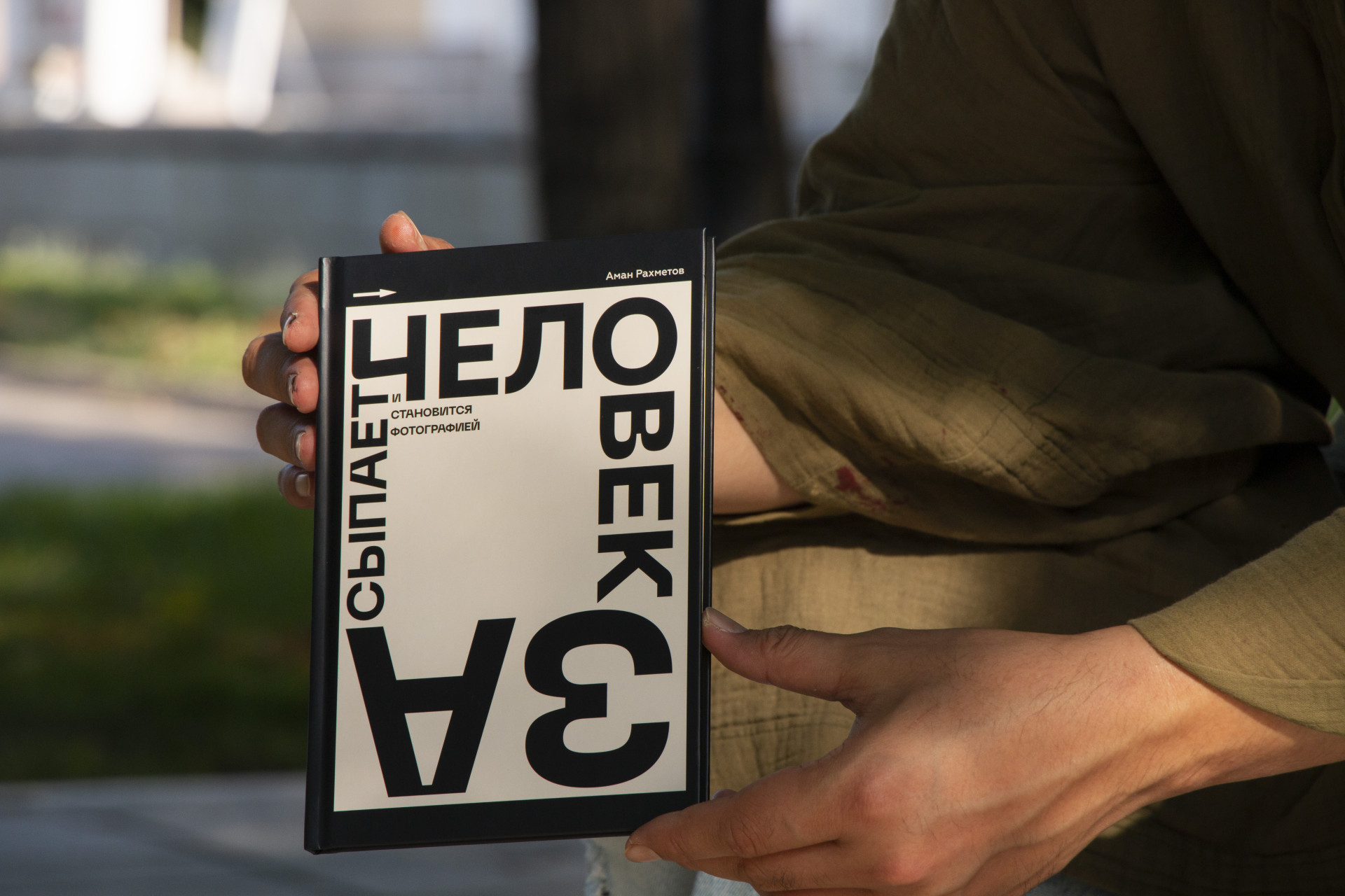 Мы остановились недалеко от Дома учёных на улице Уалиханова. Там Аман достал из рюкзака свою книгу "Человек засыпает и становится фотографией". Она издана на плотной бумаге, с жёлтым форзацем, в стильном и минималистичном дизайне — обложку рисовала художница Зоя Фалькова. Для него эта книга стала больше, чем собрание стихов: она собрала годы жизни, кризисов, поиска себя и своей формы.