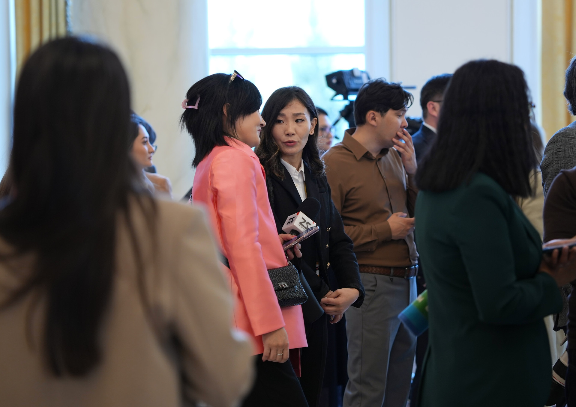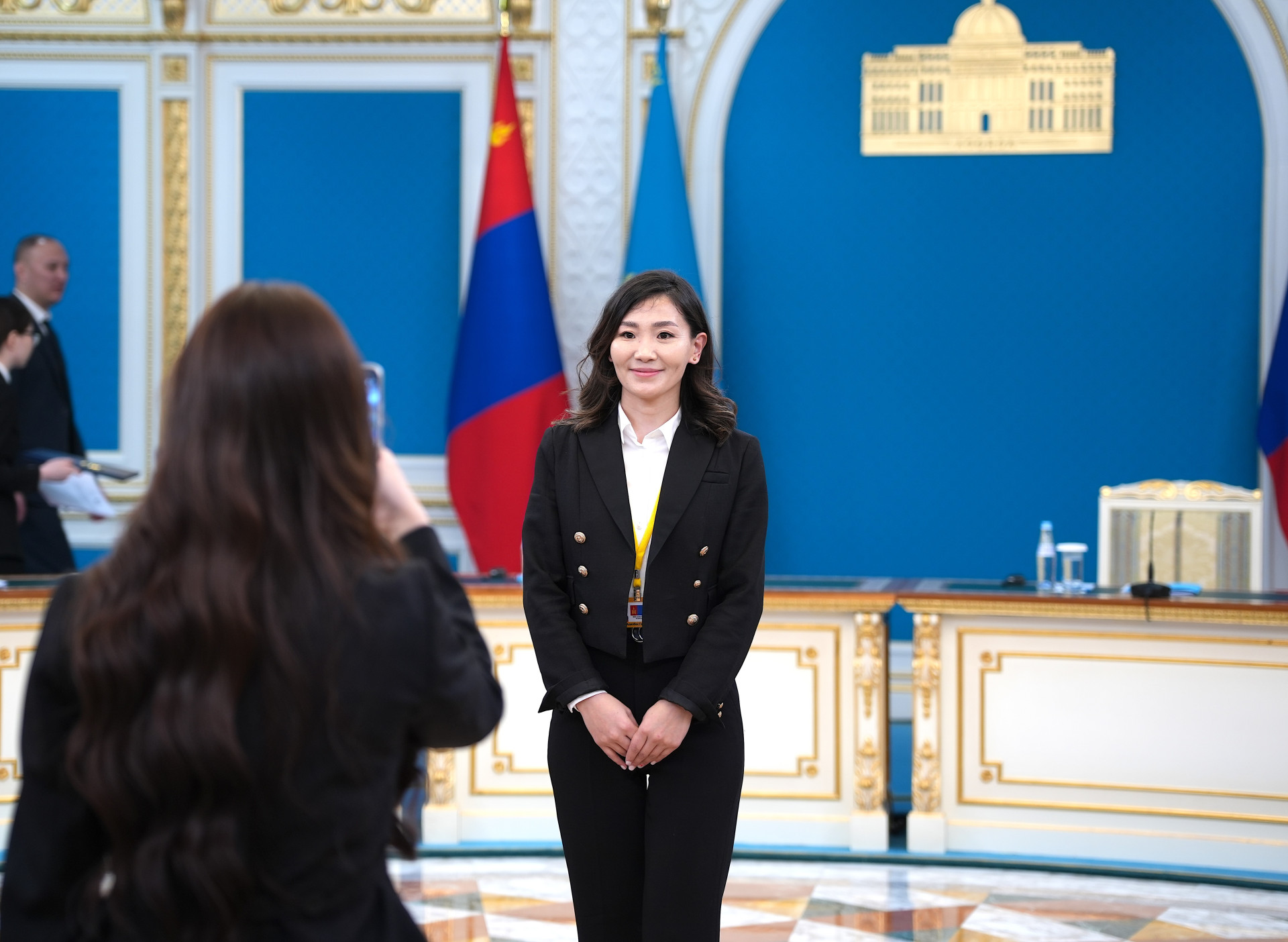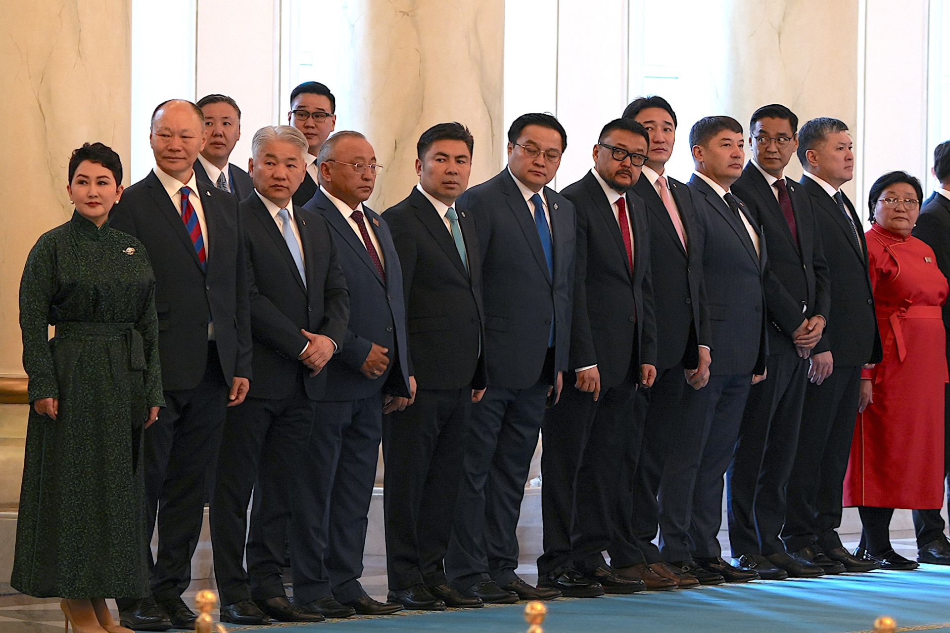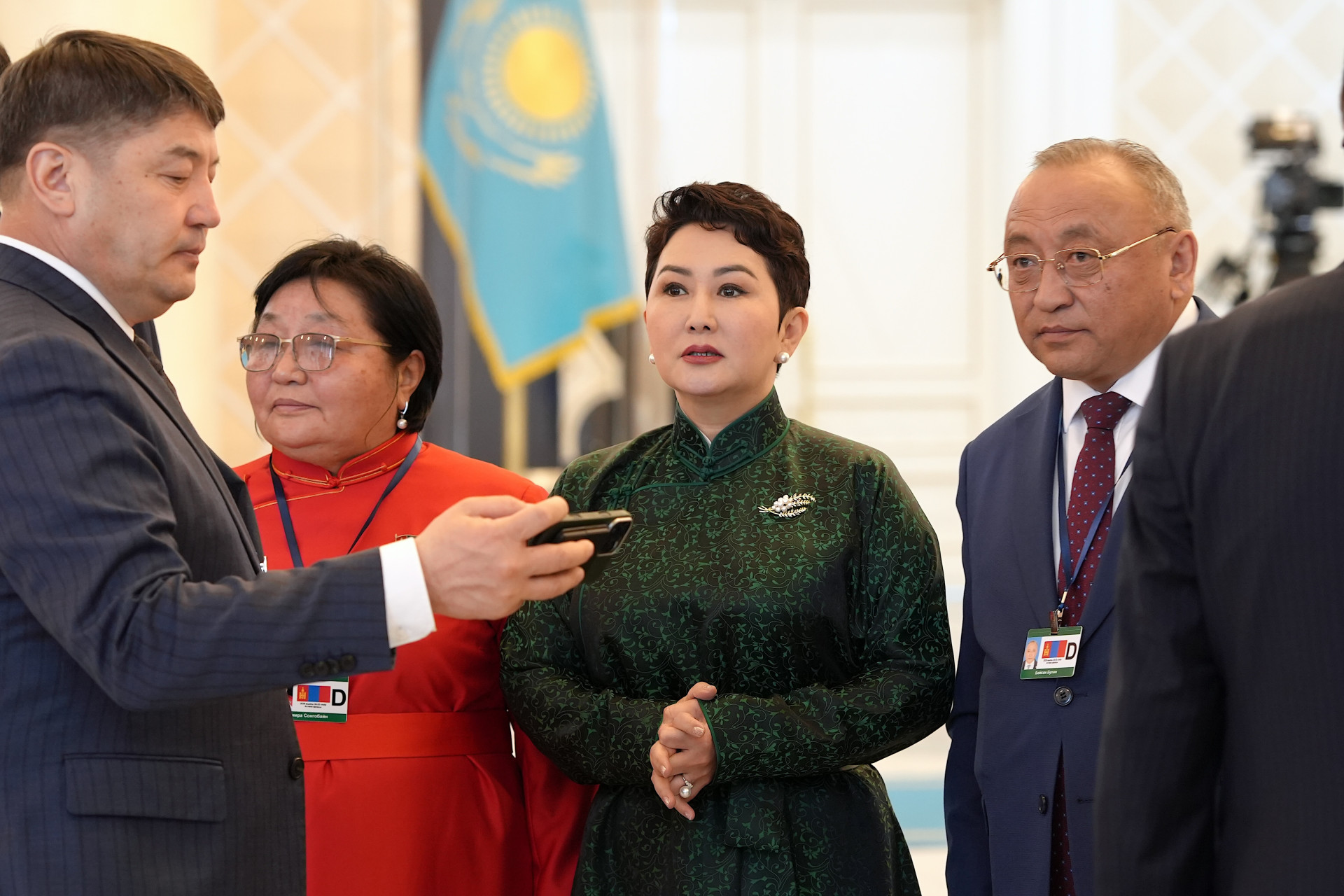 Глава МИД Монголии Батмунх Батцэцэг — в национальном дээле густого зелёного цвета с серебряной брошью. Она в центре. К ней подходят с вопросами, её слушают внимательно. Её просят об интервью.