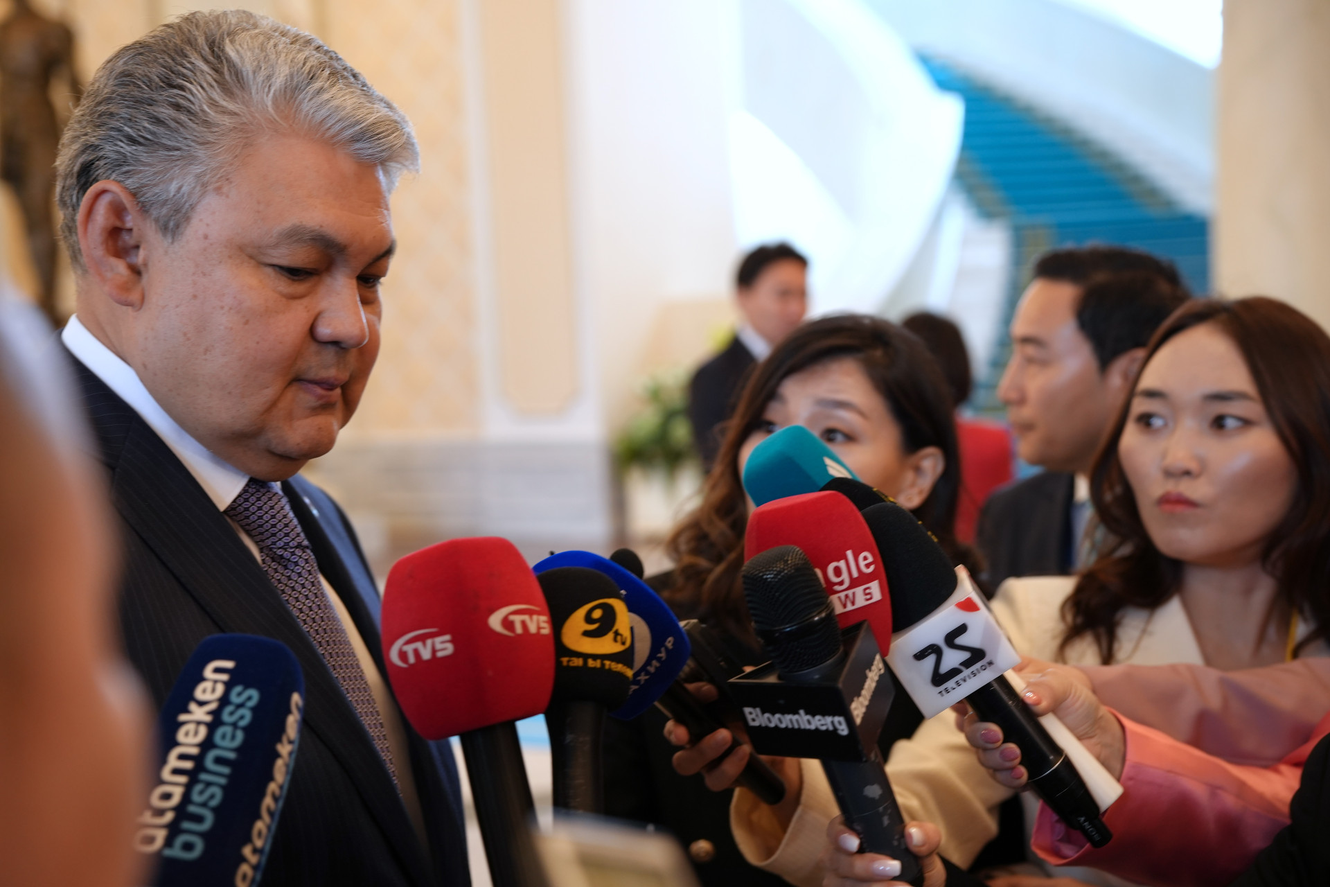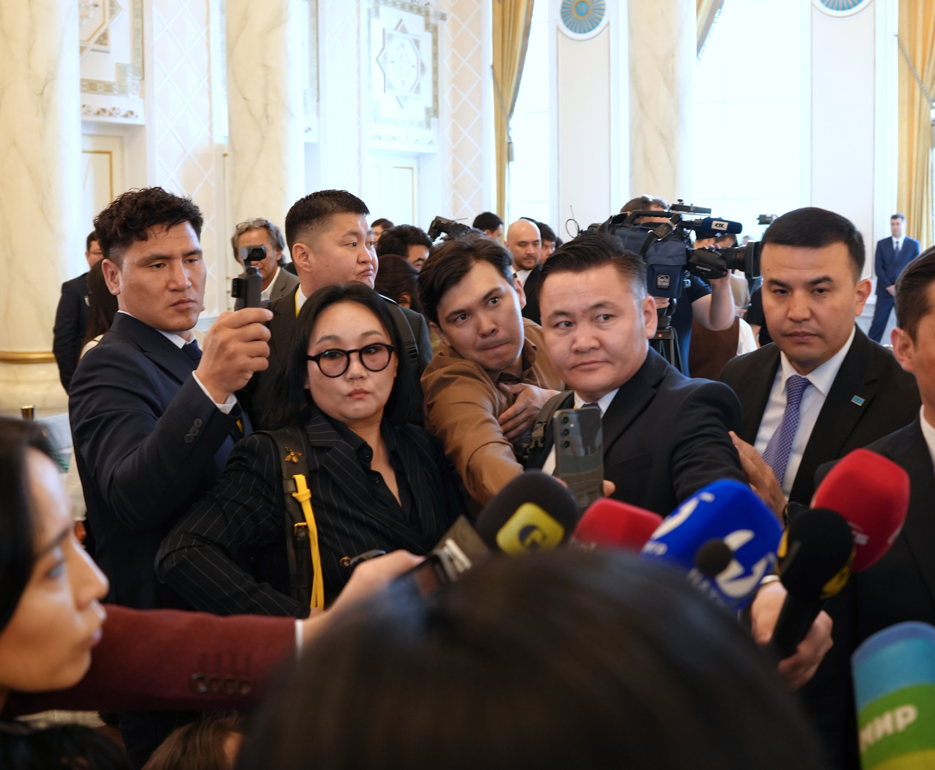 А через несколько минут всё наоборот. Монгольские журналисты обступают главу МИД Казахстана Ермека Кошербаева.