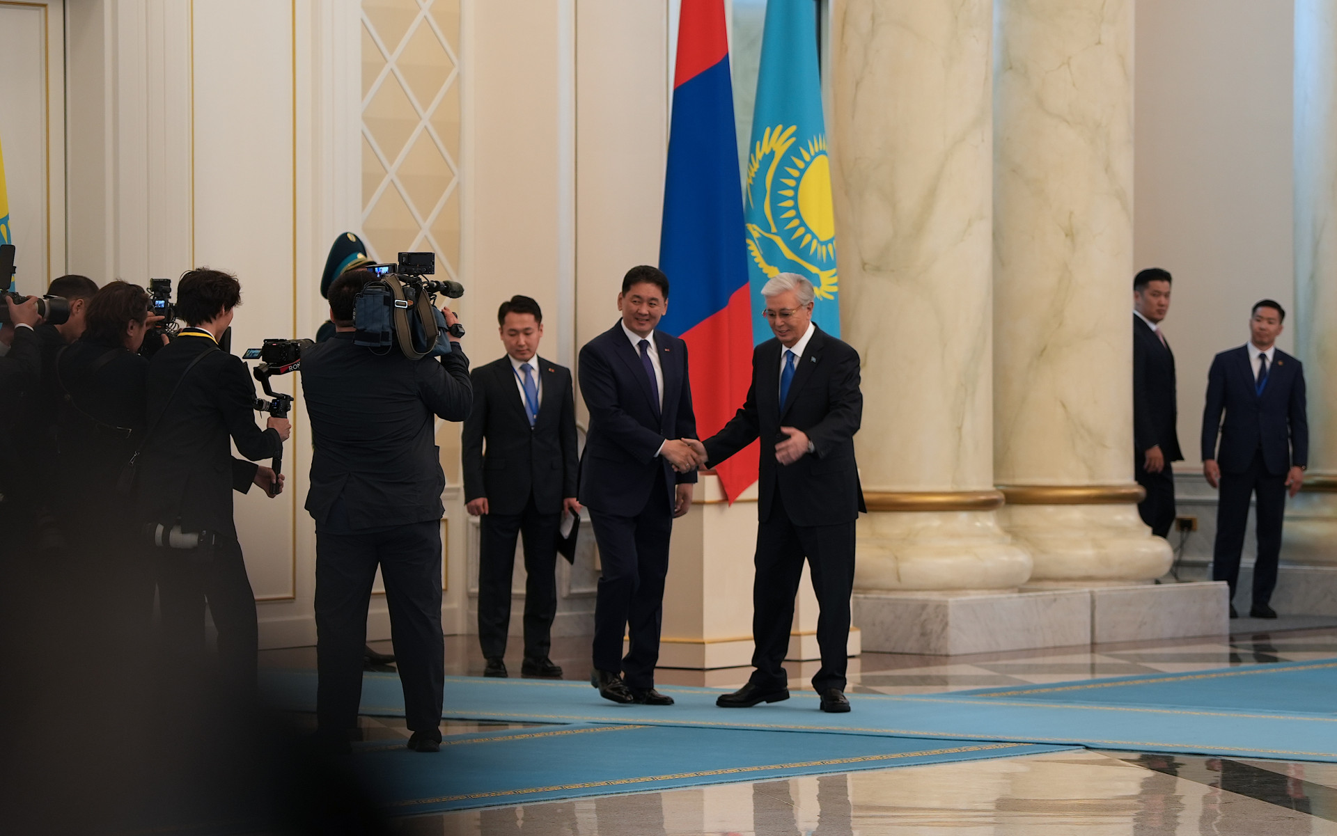 У порога Акорды президента Монголии традиционно встретил Касым-Жомарт Токаев. Тёплое рукопожатие с порога задало характер всей встречи.