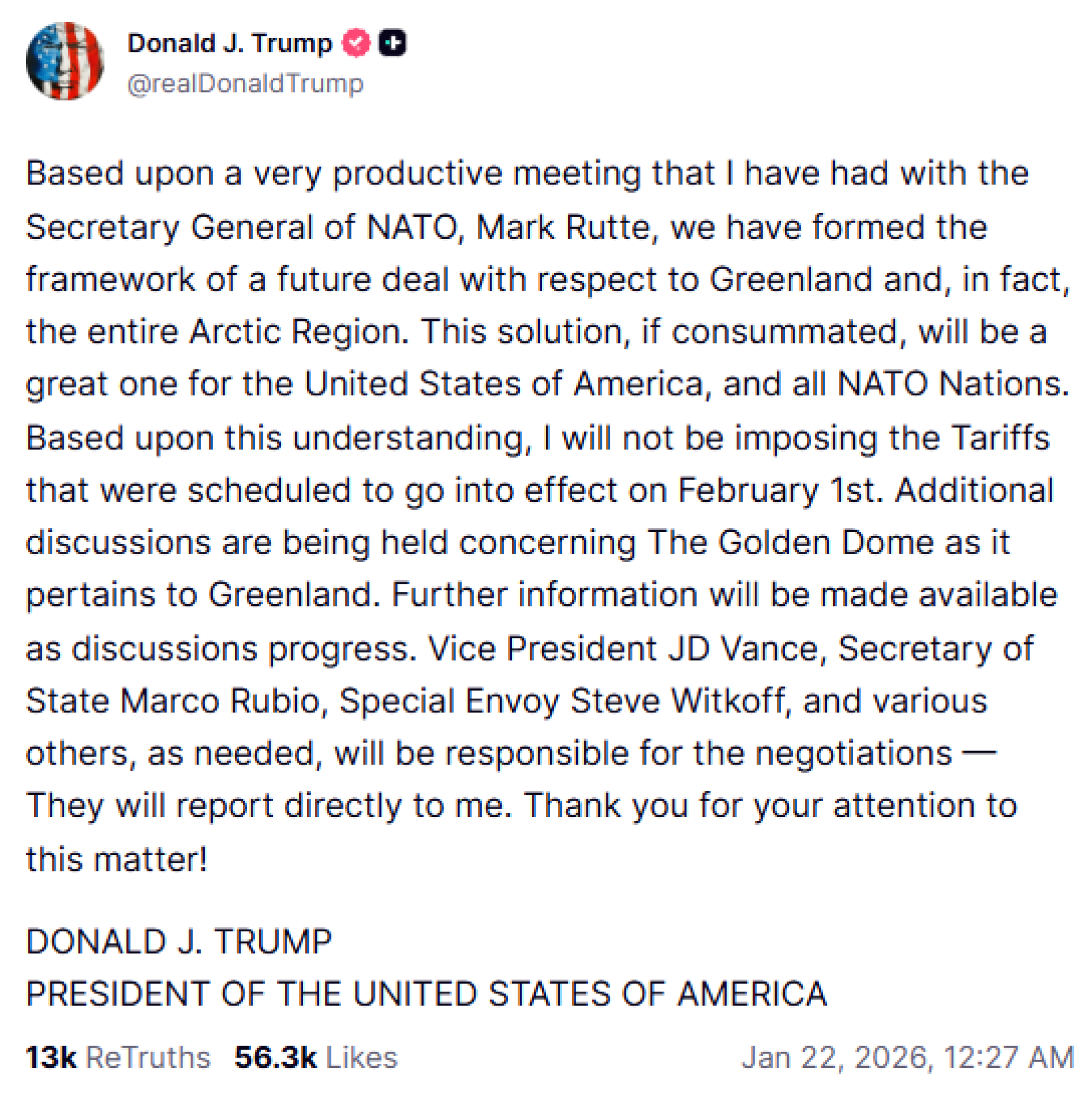 • Ключевым стало то, что дальнейшие обсуждения Гренландии были переданы на уровень американской бюрократии и профильных чиновников. Это позволило Европе снизить накал риторики и избежать немедленной торговой эскалации.