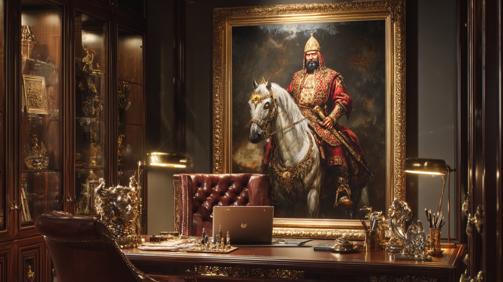 "На картине изображен военачальник в воинских доспехах красного цвета, сидящий на белой лошади, а в правой руке у него меч...", "Алтын Адам