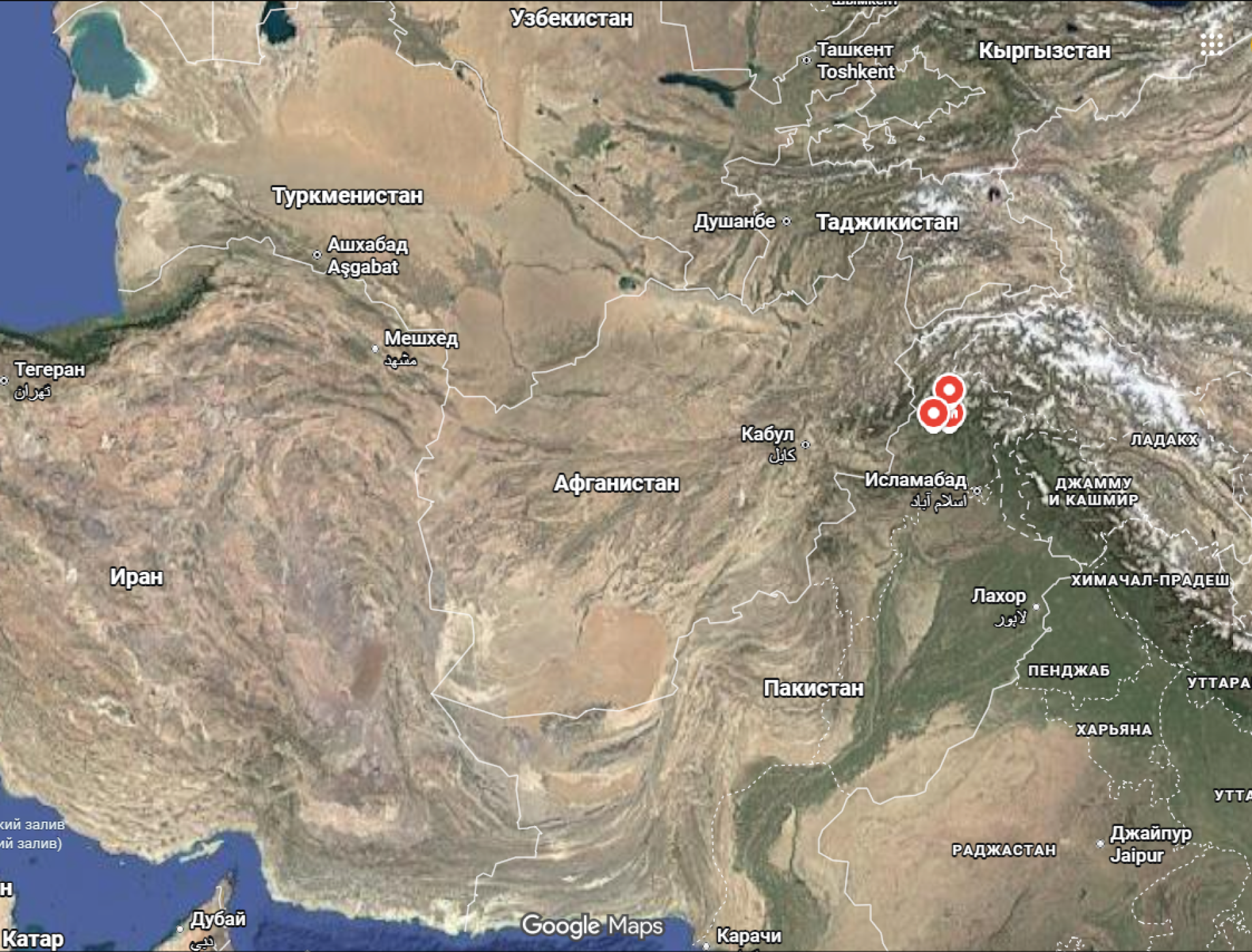 На карте из Google Maps красными метками отмечена долина Сват в Пакистане на границе с Афганистаном