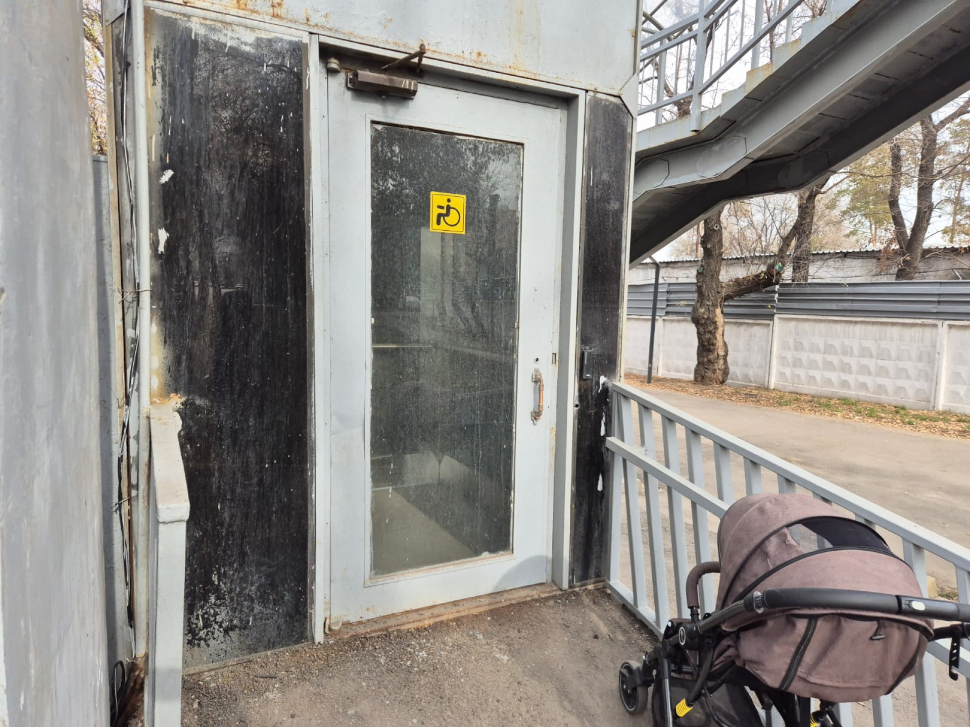 У кабинки, словно в укор, припаркована детская коляска — на этом надземном переходе в Алатауском районе лифт не работает, а пандусов нет. Алматы, ноябрь 2025 года. Фото: ©️ Tengrinews.kz / Светлана Антонова