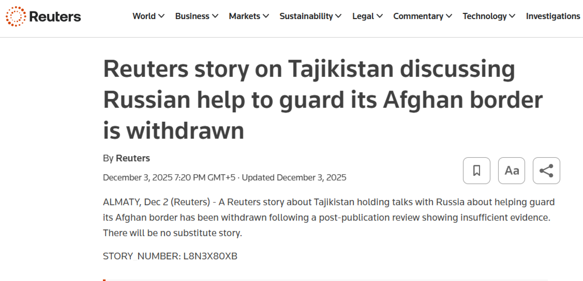 Скриншот с сайта Reuters. В публикации говорится, что материал о переговорах Таджикистана с Россией о помощи в охране границы с Афганистаном был отозван, так как проверка после публикации показала недостаточность доказательств