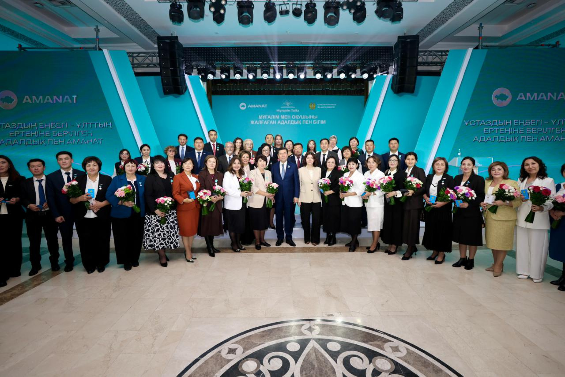 В завершении мероприятия Ерлан Кошанов вручил ряду участников партийную награду "Ұстаз – ұлт айнасы". Начиная с текущего года это будет постоянной наградой, которой ежегодно будут отмечаться лучшие педагоги страны. Также за заслуги в профессиональной деятельности ведомственные награды учителям вручили заместитель премьер-министра – министр искусственного интеллекта и цифрового развития Жаслан Мадиев и министр просвещения Жулдыз Сулейменова.