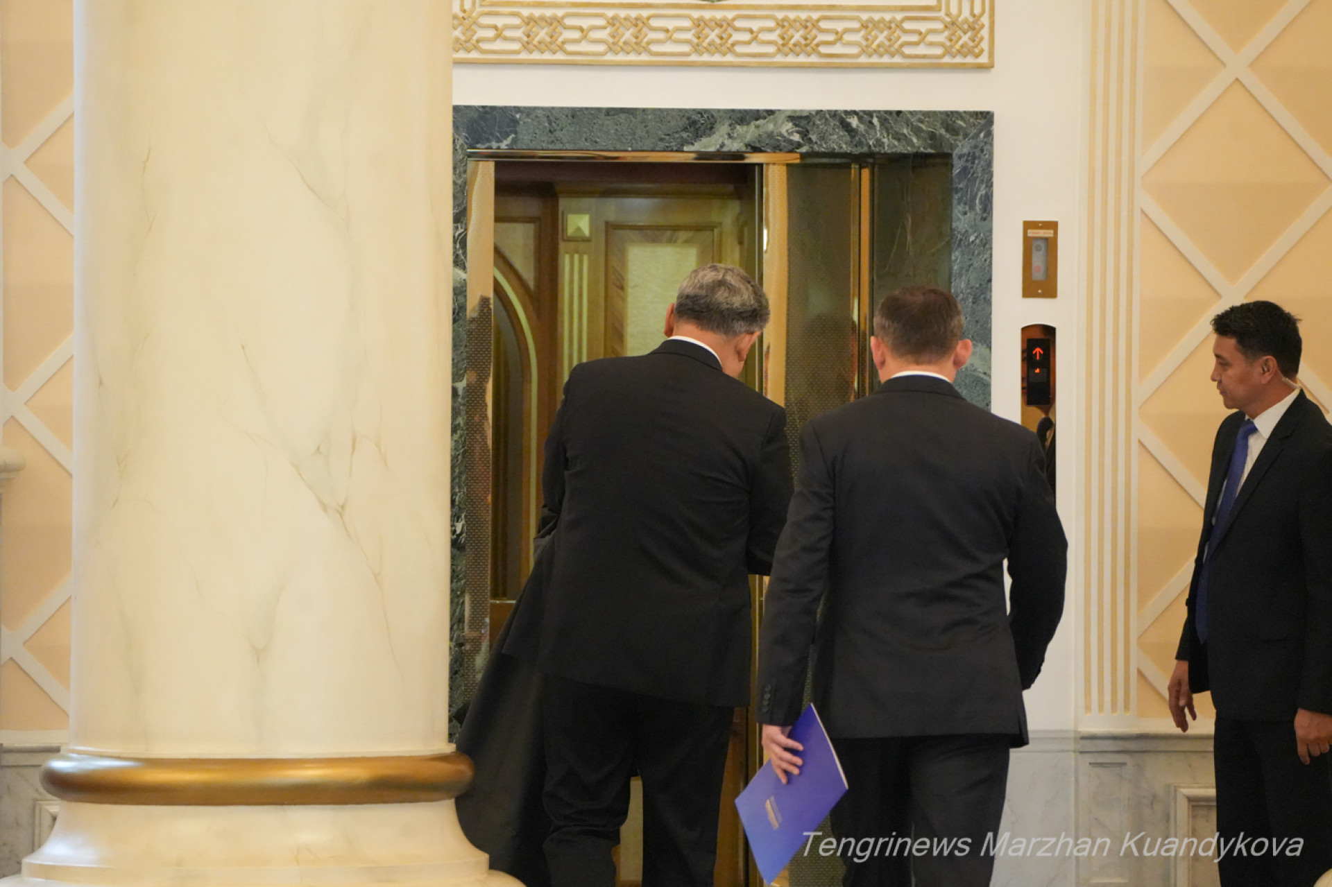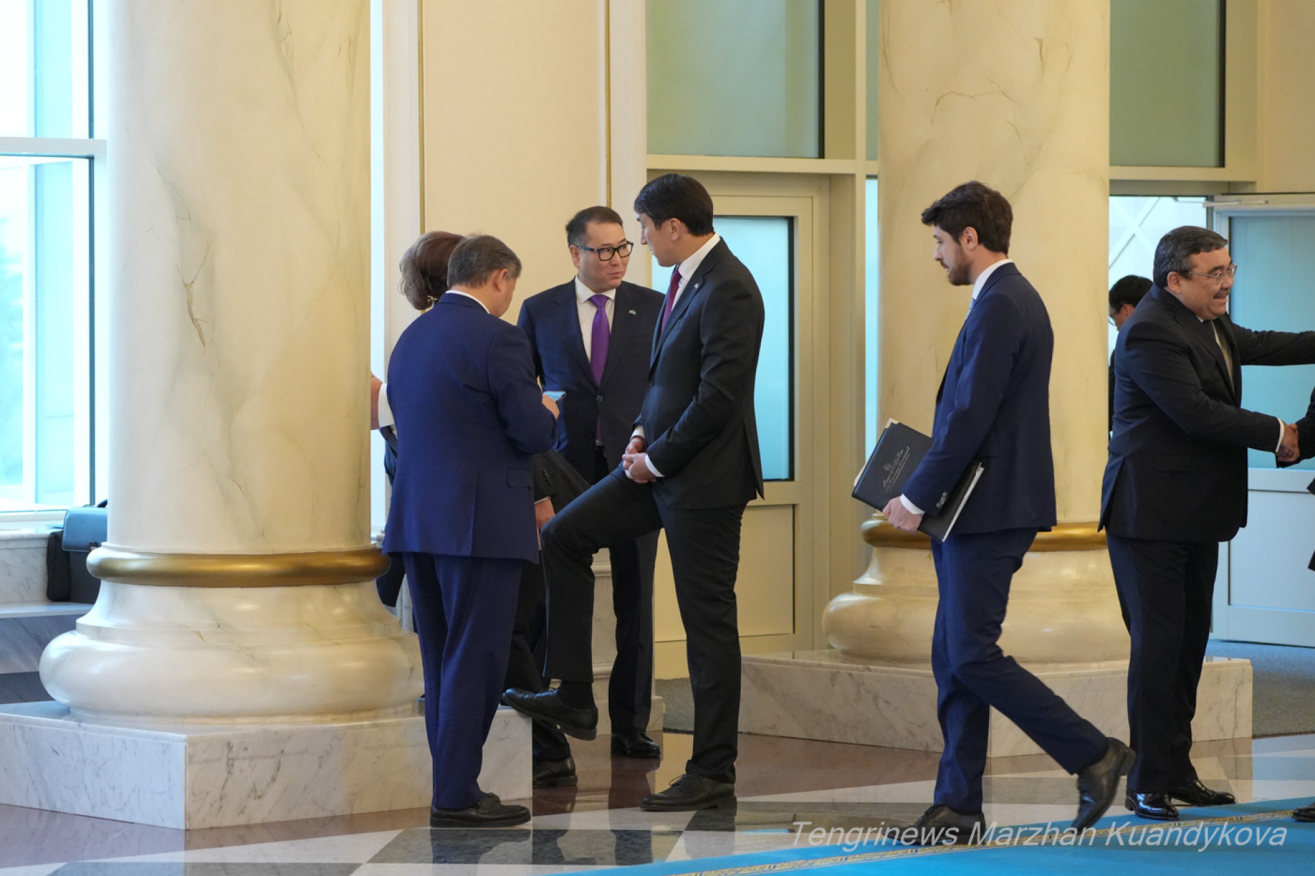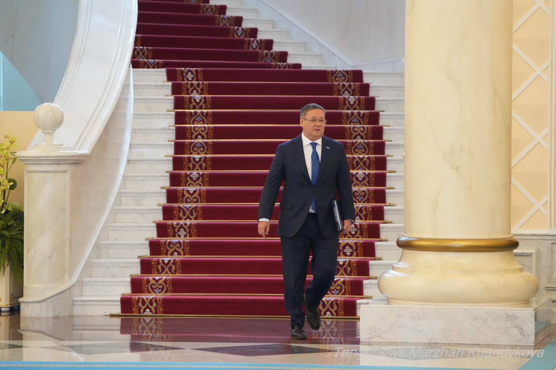 Уже бывший министр иностранных дел Мурат Нуртлеу спустился в холл сверху по большой лестнице. Помощник Президента выглядел спокойным, можно сказать, даже в приподнятом настроении.