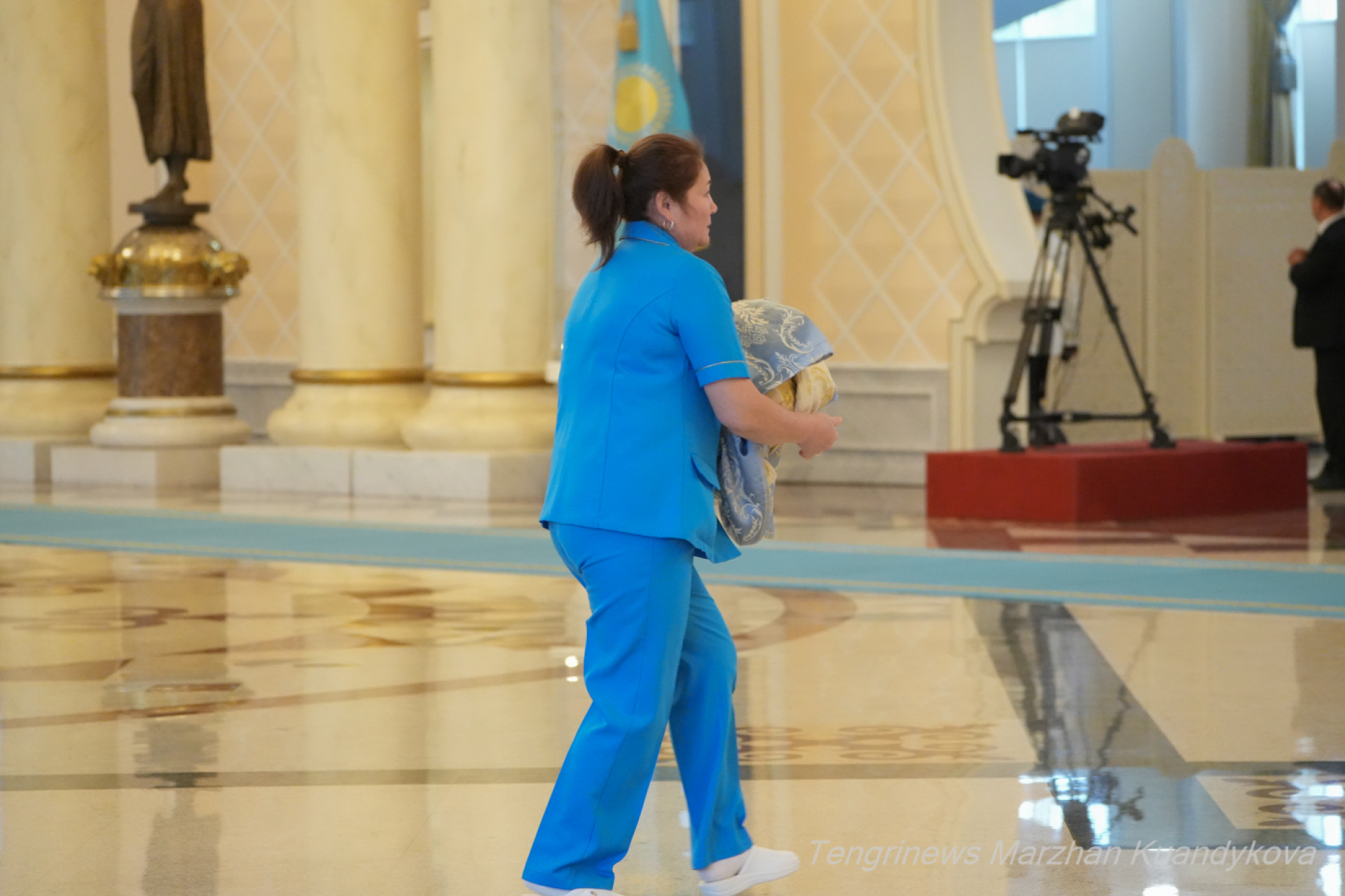 Мраморные колонны блестят, колонны протирают. Рабочие раскатывают ковровую дорожку, по которой позже пройдёт президент Италии.
