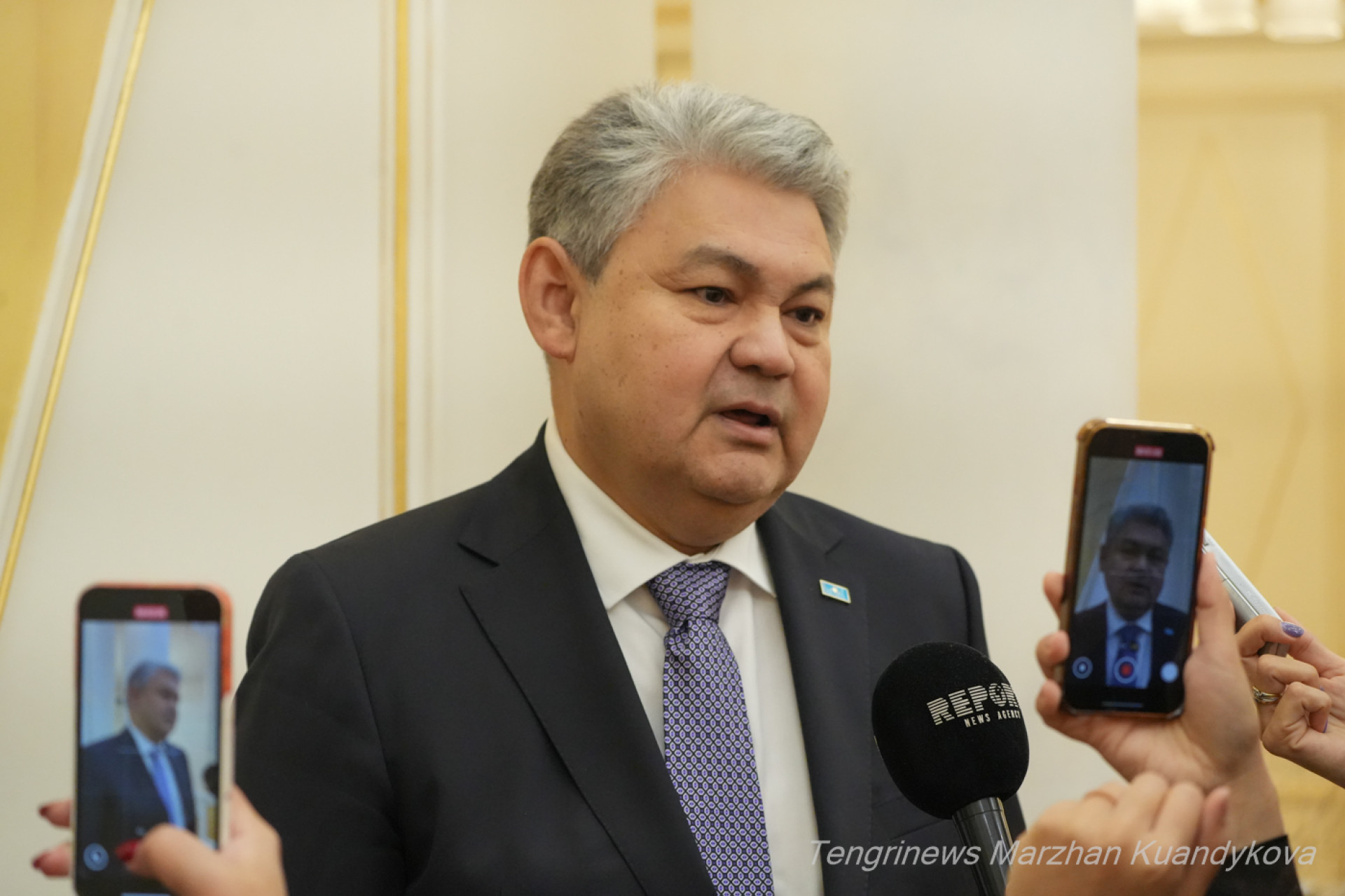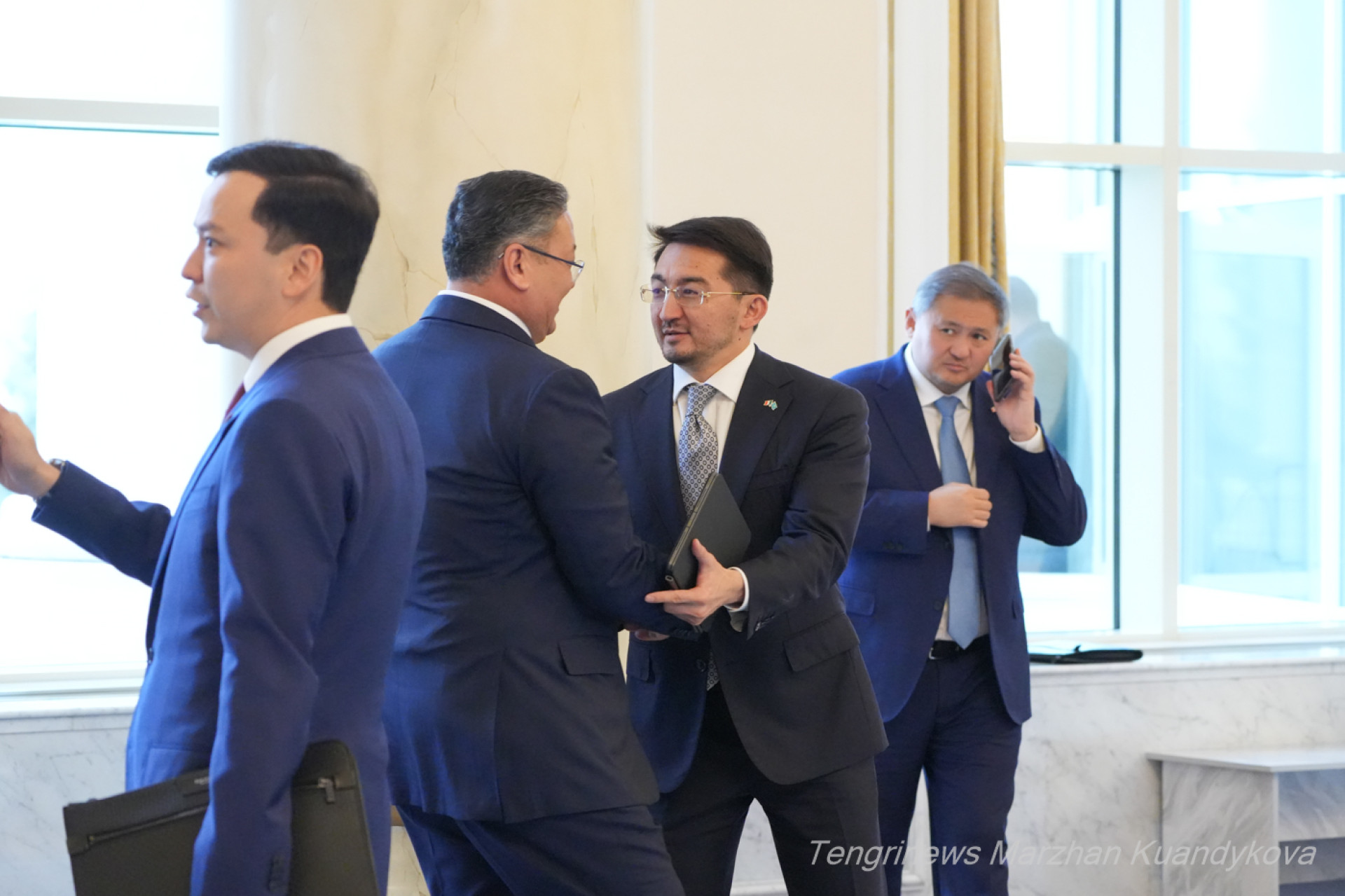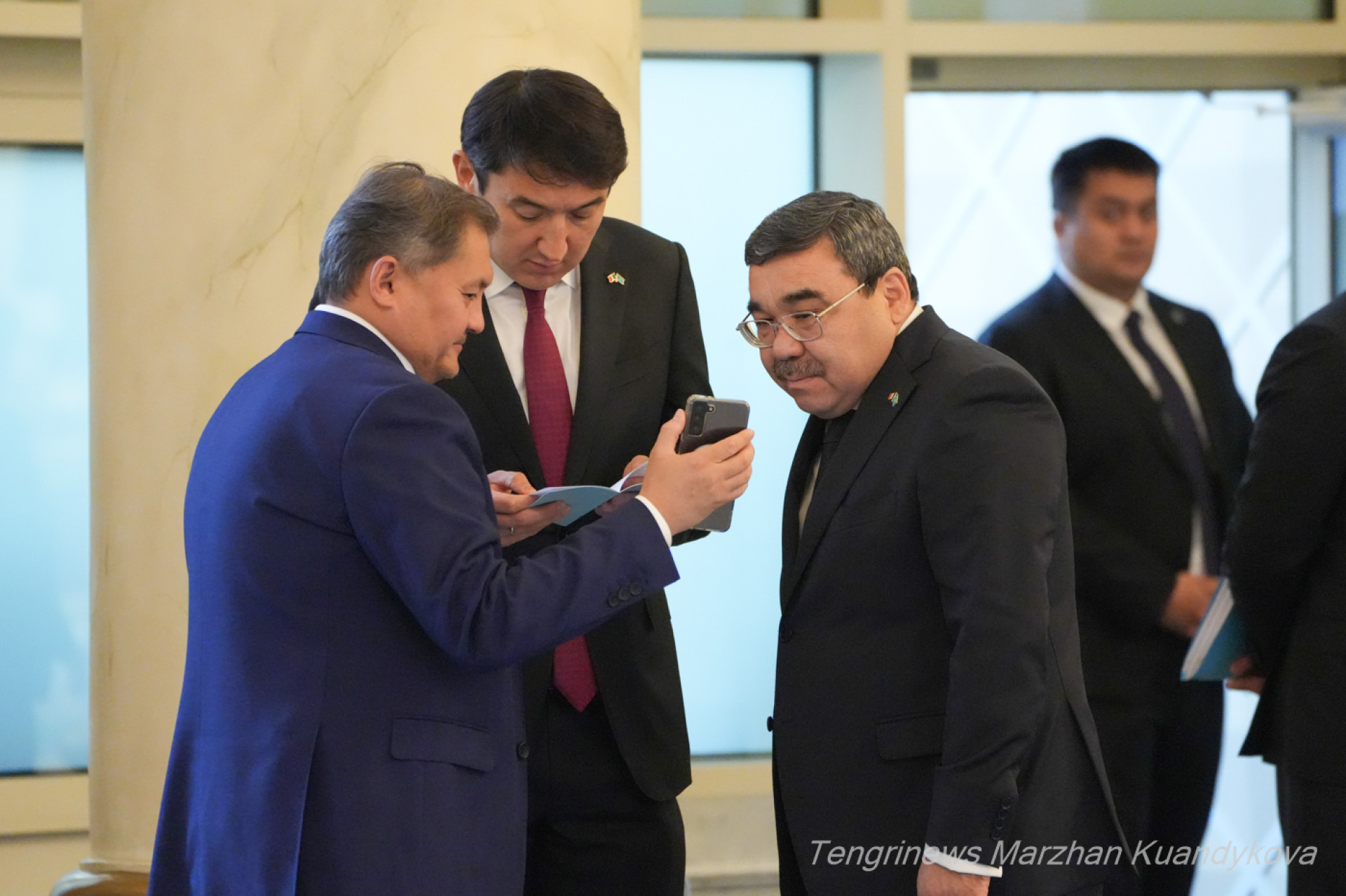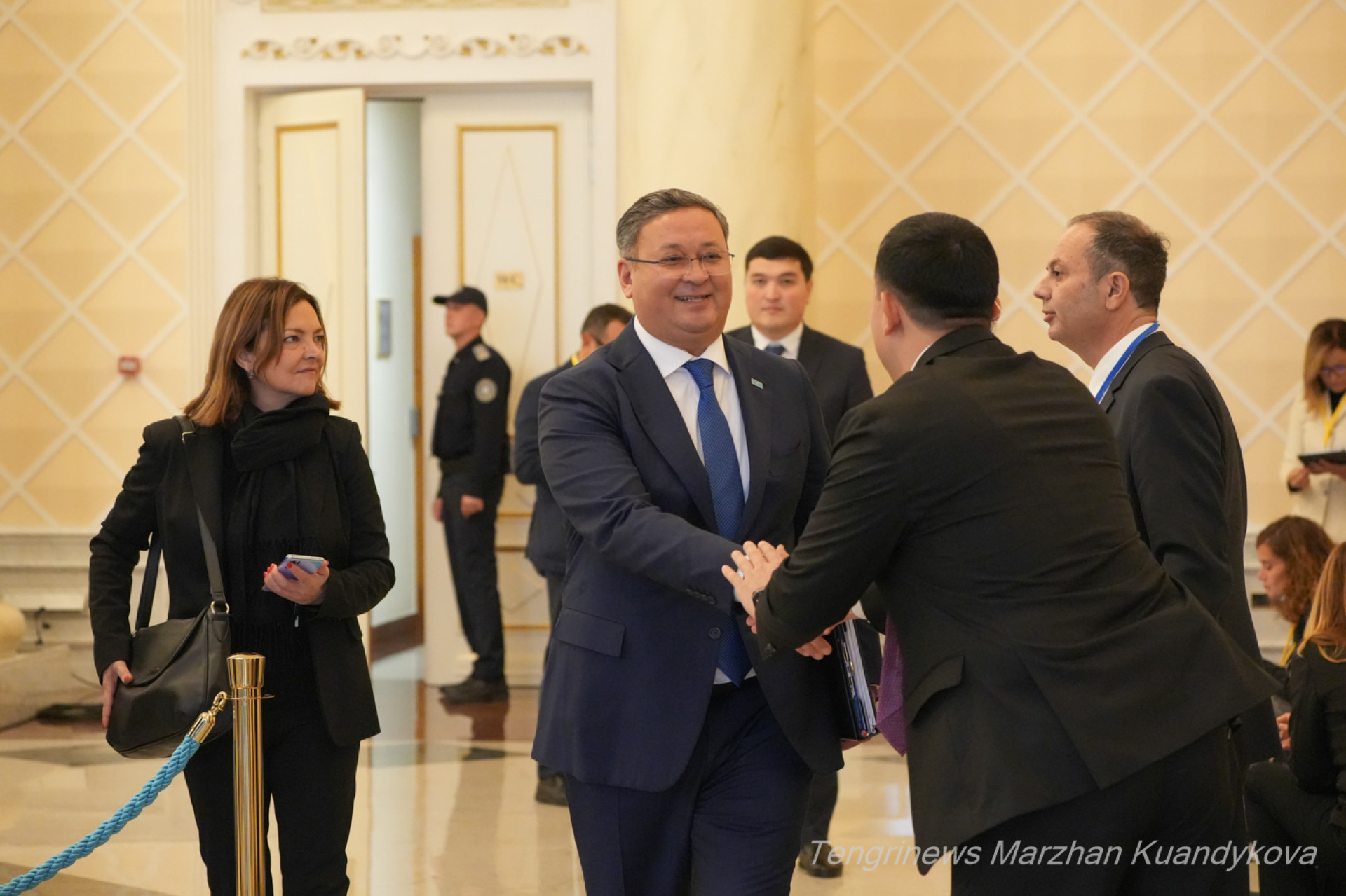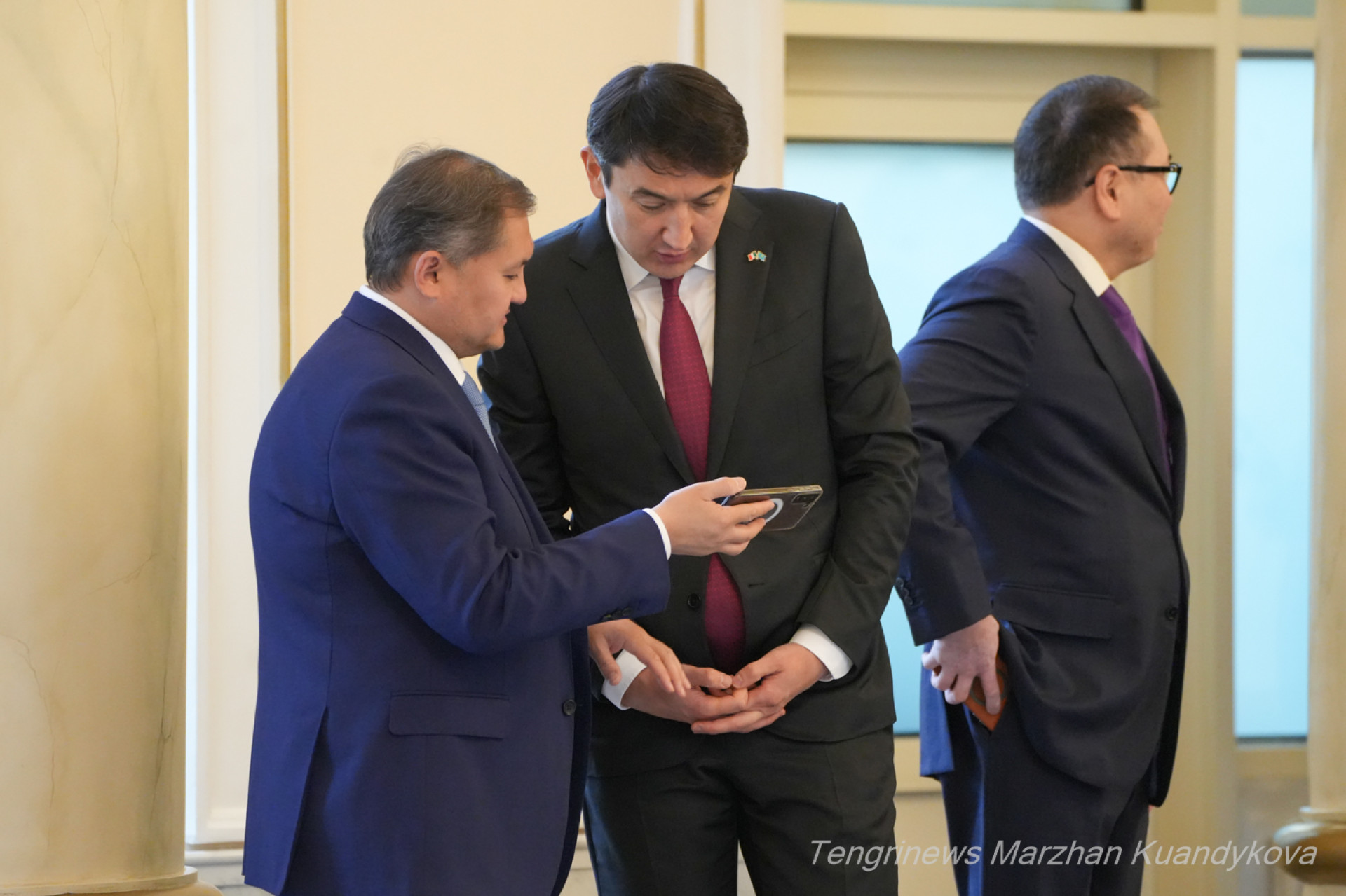 Те, кто не против ответить на вопросы СМИ, проходят в пресс-зал. Вот, к примеру, посол Казахстана в Италии Ерболат Сембаев. Министр торговли и интеграции Арман Шаккалиев готовит дипломата к интервью: поправляет пиджак перед камерами.