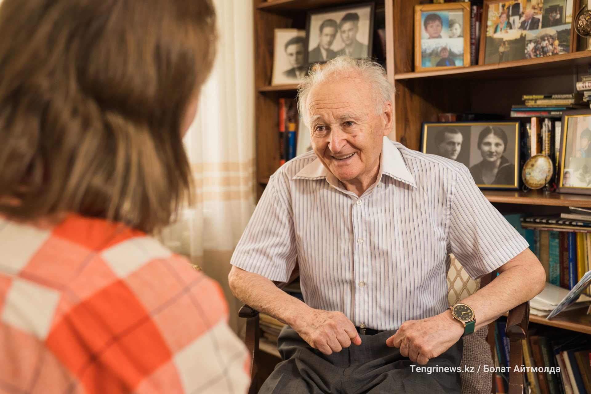 Журналист Оксана Акулова беседует с Михаилом Ефимовичем Зельцером. Фото: ©️ Tengrinews.kz / Болат Айтмолда