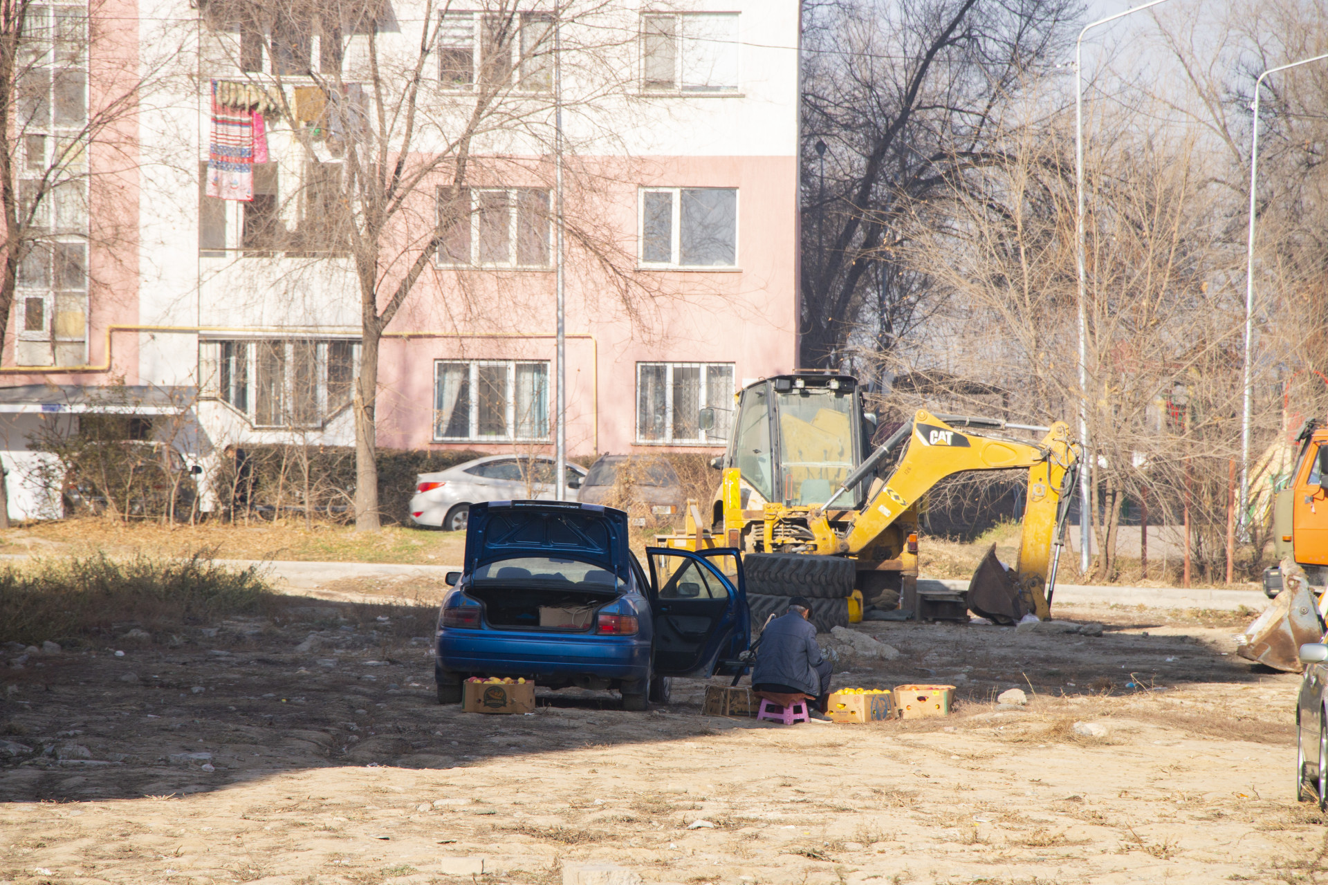 Обращаем внимание вот на что: хотя большинство дворов здесь благоустроены, встречаются и пустыри. Из-за нехватки мест они превращаются в парковки. Посреди одного такого пустыря сидит мужчина с несколькими коробками яблок.