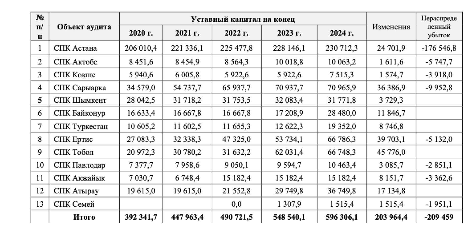 Например, у СПК "Астана" уставный капитал — 230 миллиардов тенге, но реально ликвидных активов — всего около 28 миллиардов. Большая часть капитала "не работает" и не может быть использована для проектов. При этом за последние 5 лет капитал СПК увеличивали за счет государства, но ситуация не улучшилась — убытки только росли.