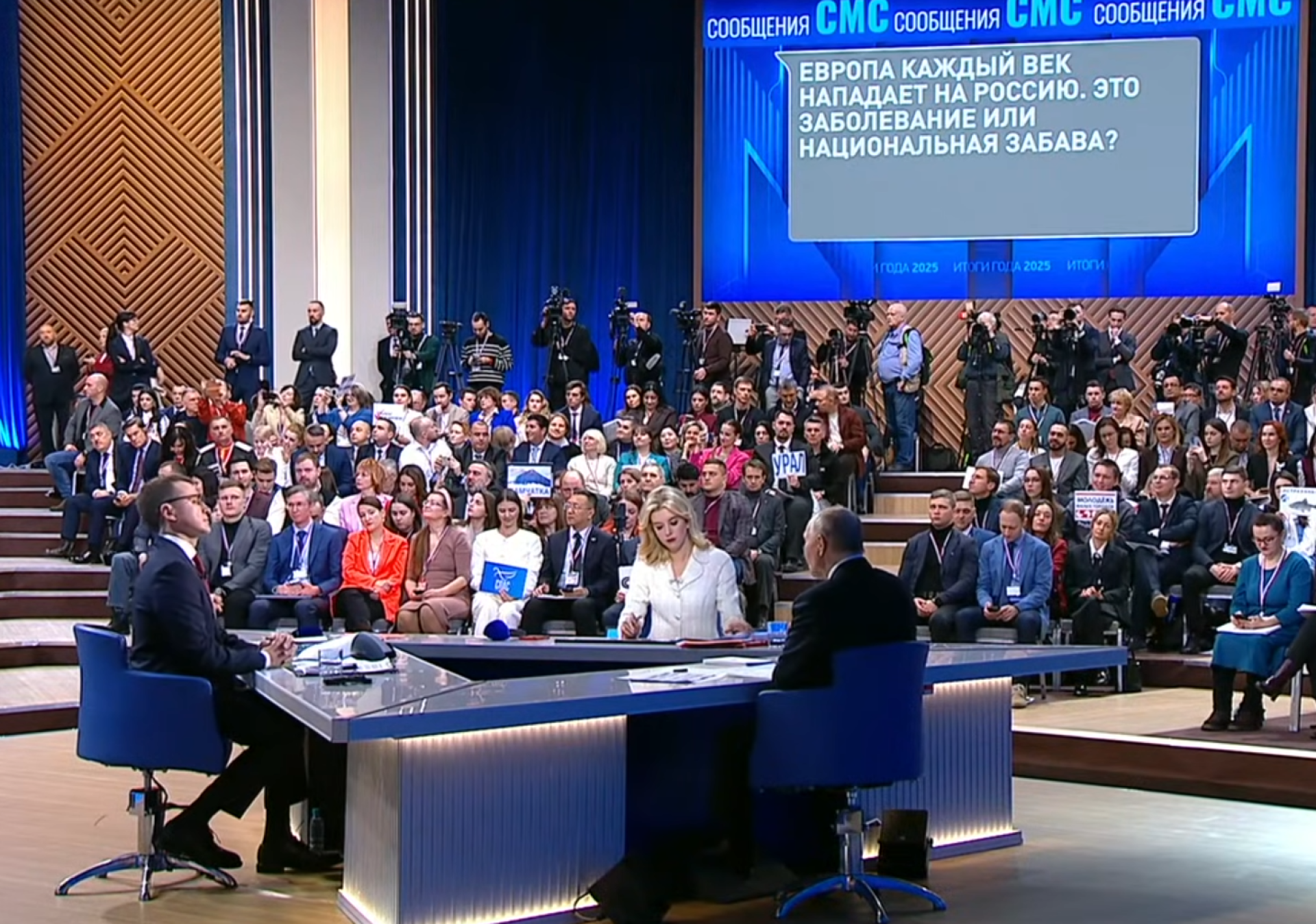 Стоп-кадр из видеотрансляции прямой линии Путина, 19 декабря 2025 года