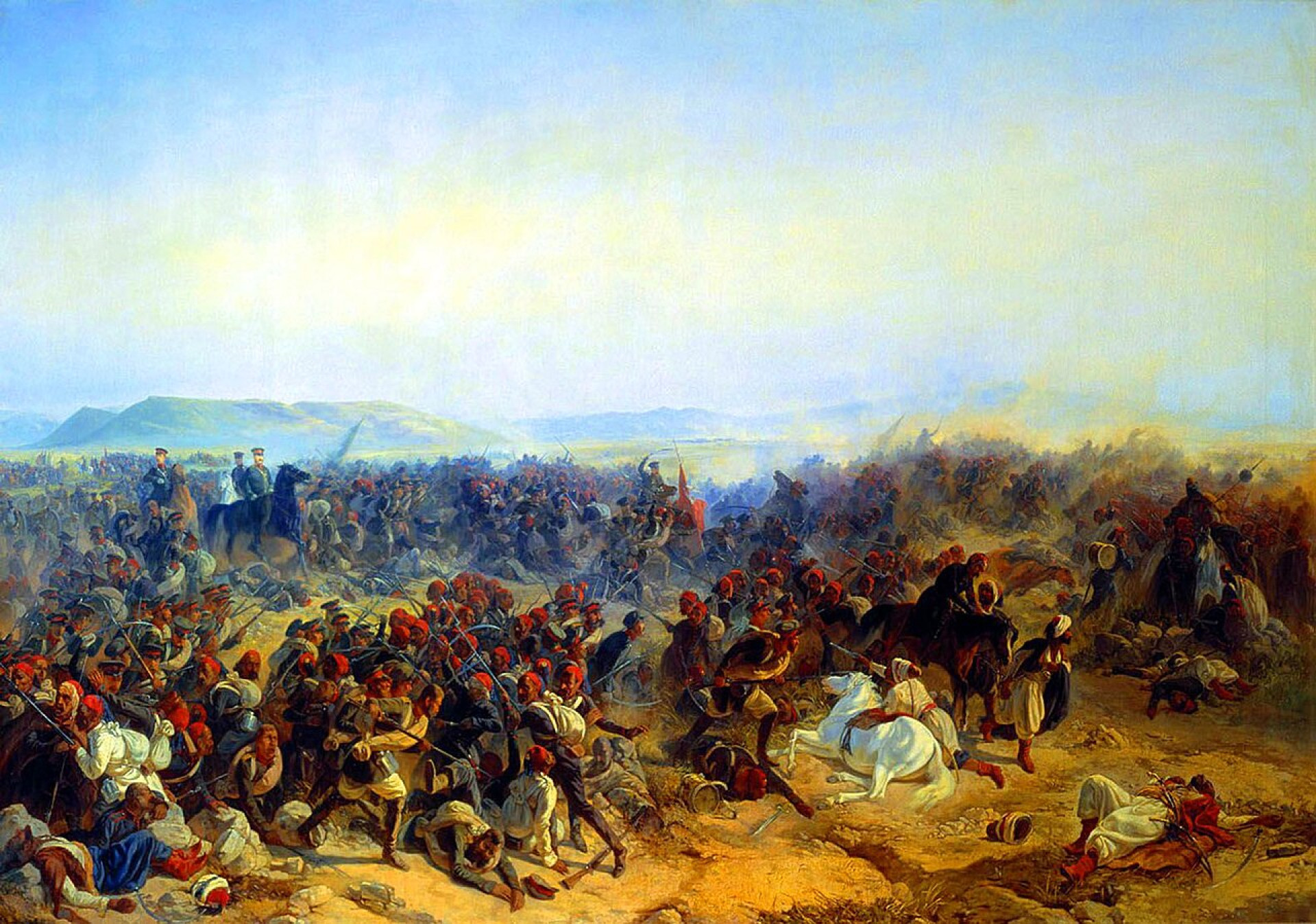 "Сражение при селении Кюрюк-Дара в окрестностях крепости Карс 24 июля 1854 года", художник Ф. И. Байков, 1854 год. Крымская война (1854-1856). Изображение является общественным достоянием