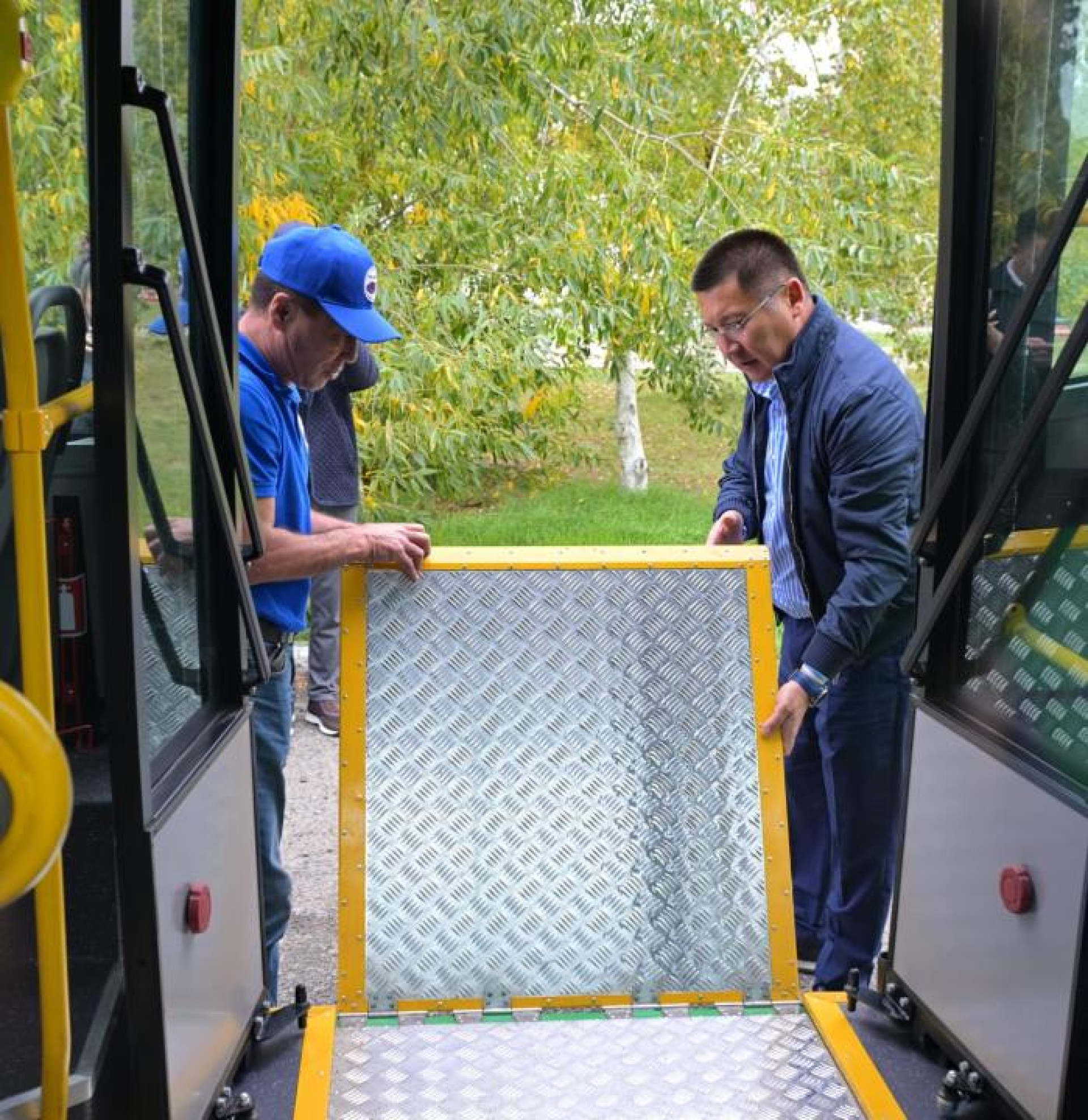 Затем лично разложил пандус, предусмотренный в автобусе: