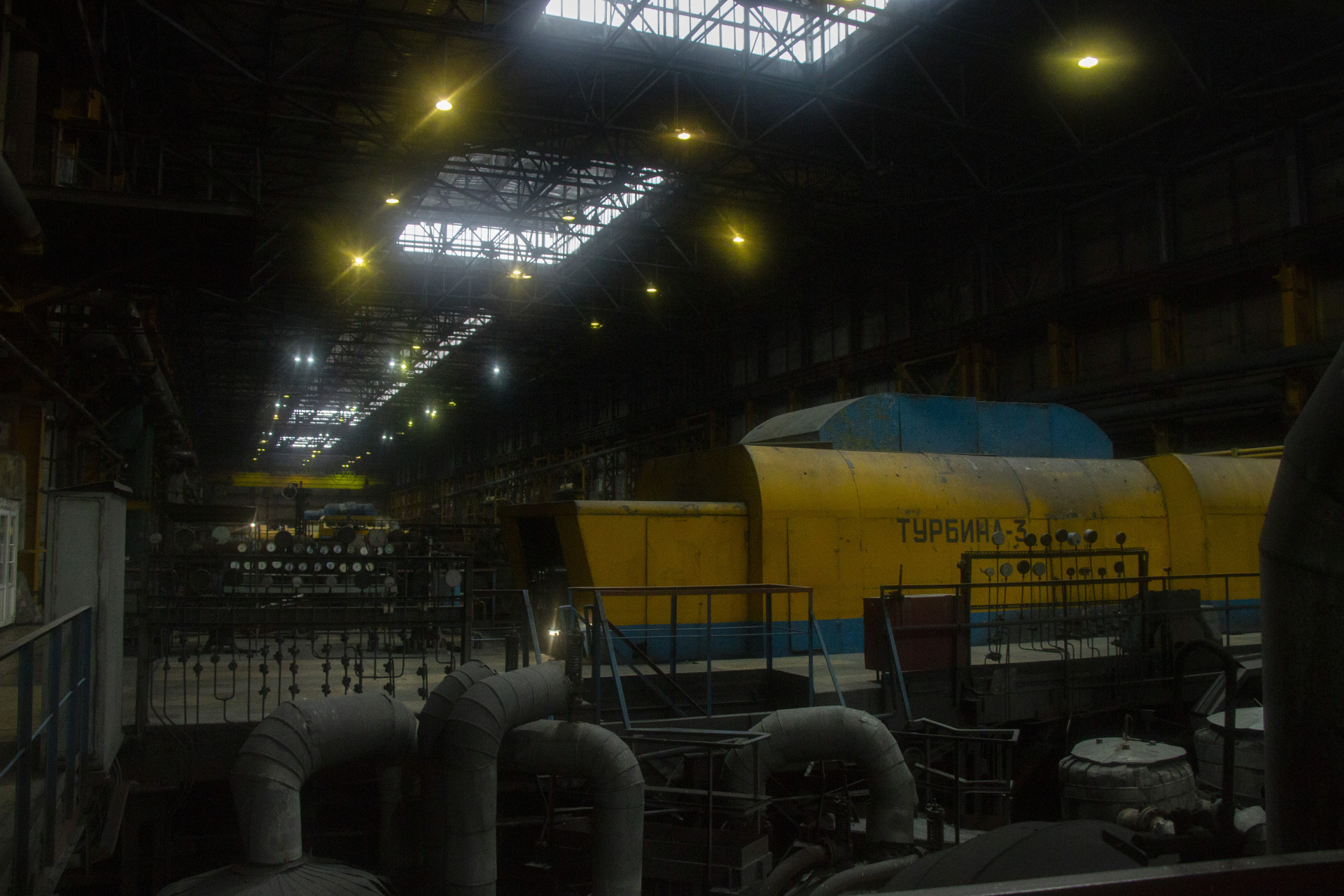 Дальше мы заходим в главный блок. Здесь расположены котлы, турбины и генераторы, а также системы, которые их контролируют. Котлов на этой станции восемь, а турбин — шесть.