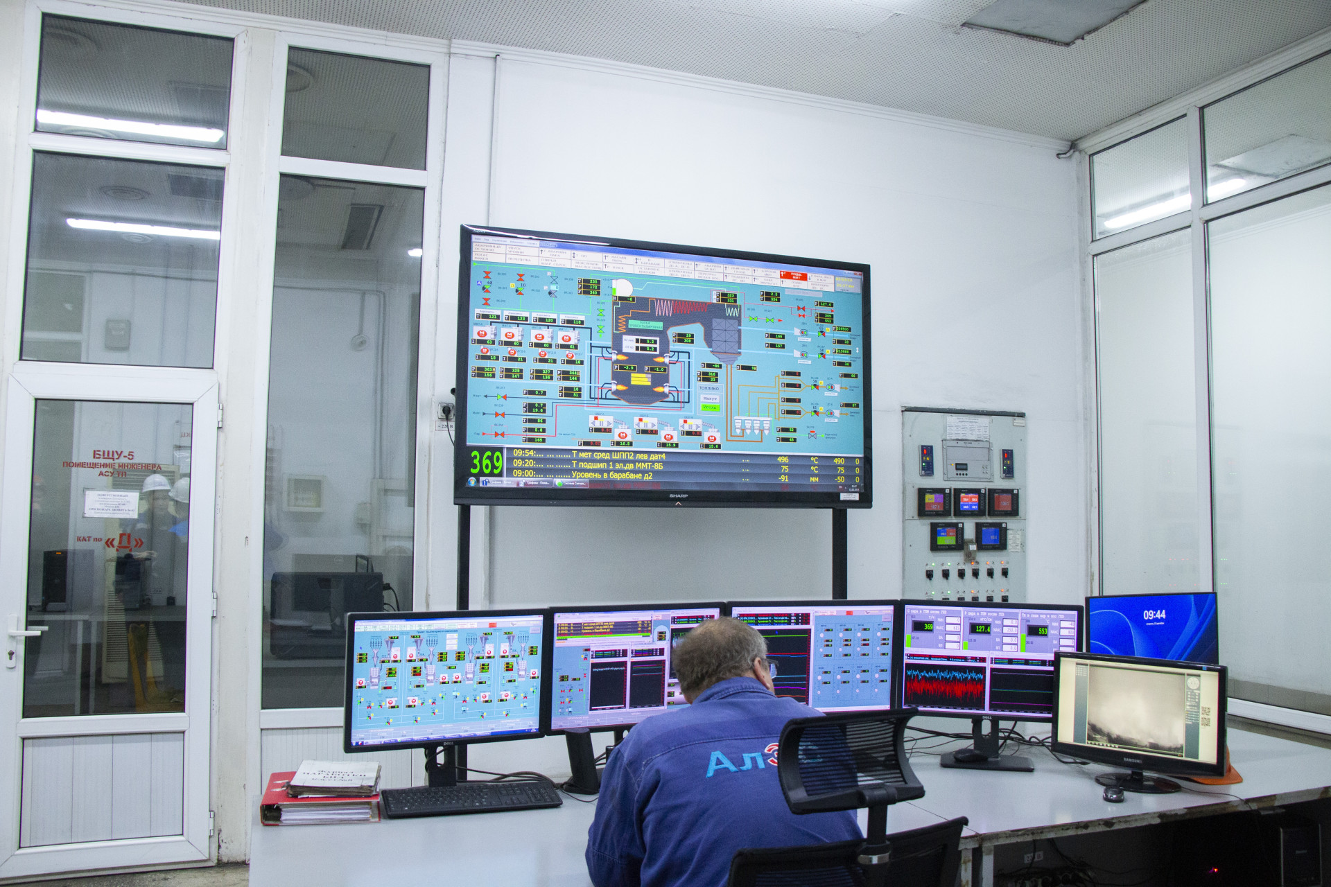 Так как котёл новый, он управляется уже с помощью современных компьютеров. Вся информация выводится на мониторы. Если сравнить щиты управления на снимках выше и этот, можно заметить, как далеко шагнул прогресс за 45 лет.