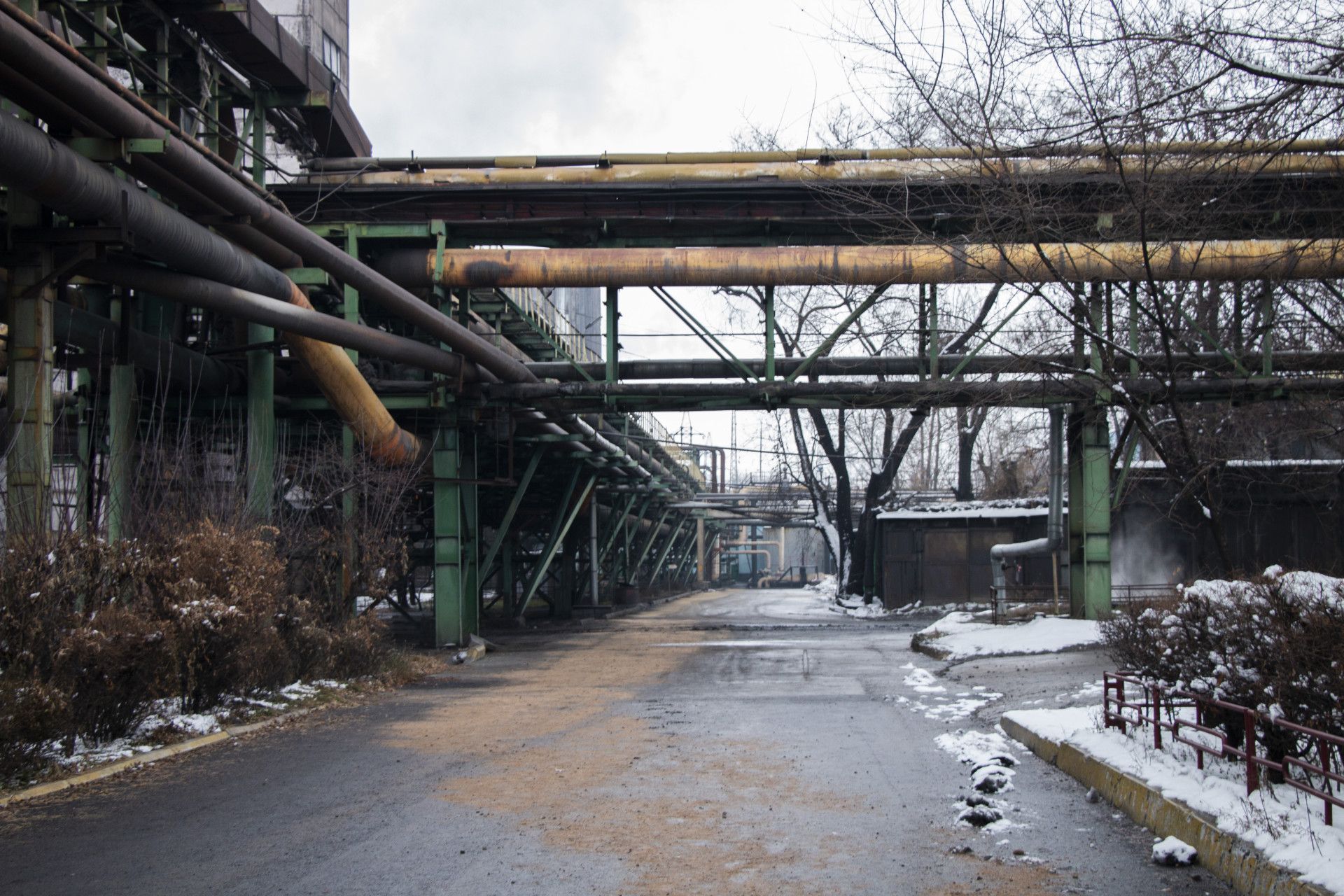 Когда мы всё-таки попадаем внутрь, нам проводят инструктаж по безопасности, выдают каску и специальную форму. На территории очень скользко, хоть все тротуары засыпаны песком. В городе в момент съёмки такого гололёда нет. Предполагаем, что это из-за выбрасываемого с местных градирен пара.
