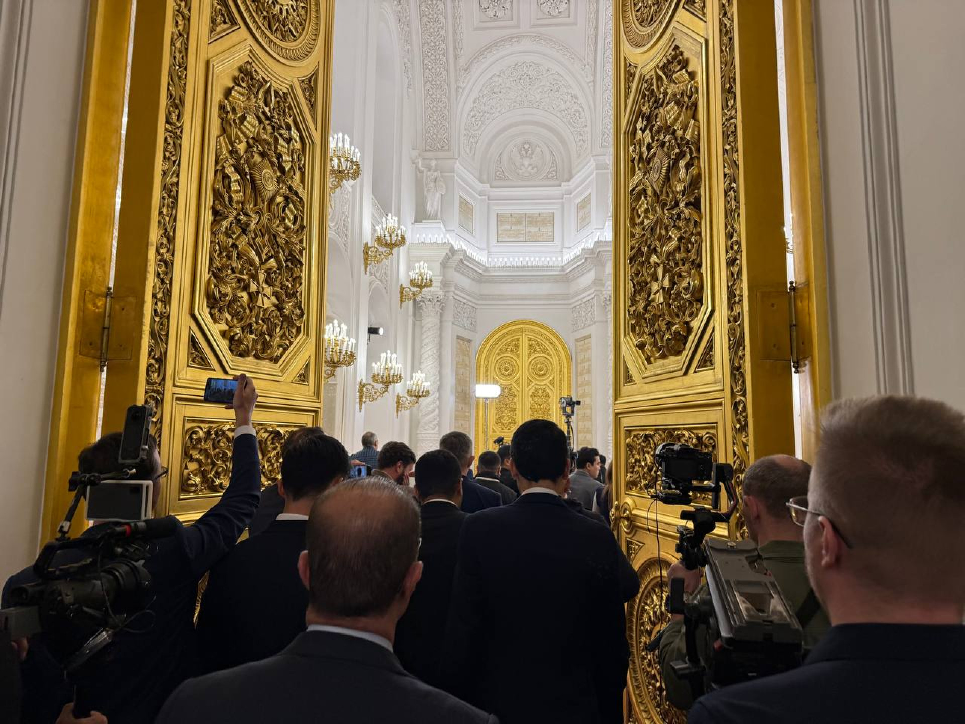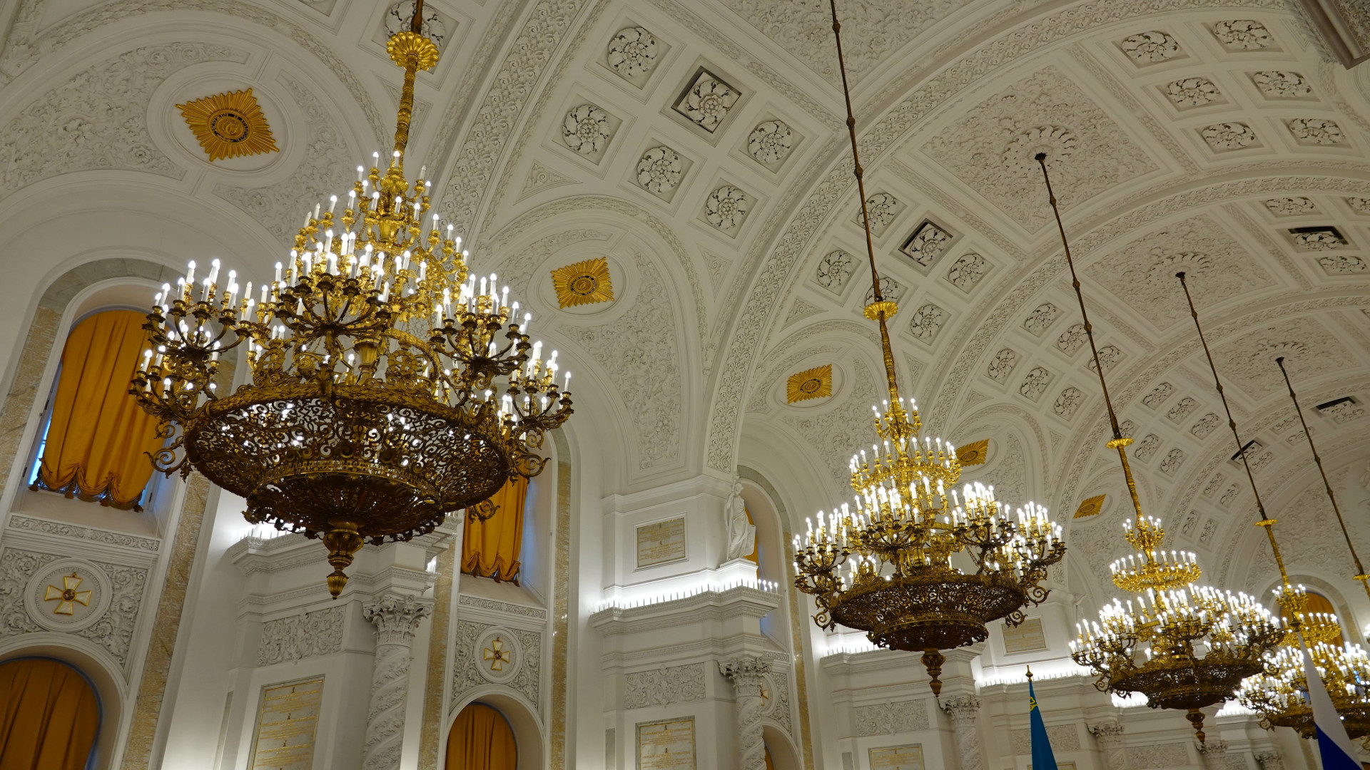 После длинных проверок и досмотров мы, наконец, входим в Георгиевский зал — через огромные золотые ворота, сияющие в свете люстр.