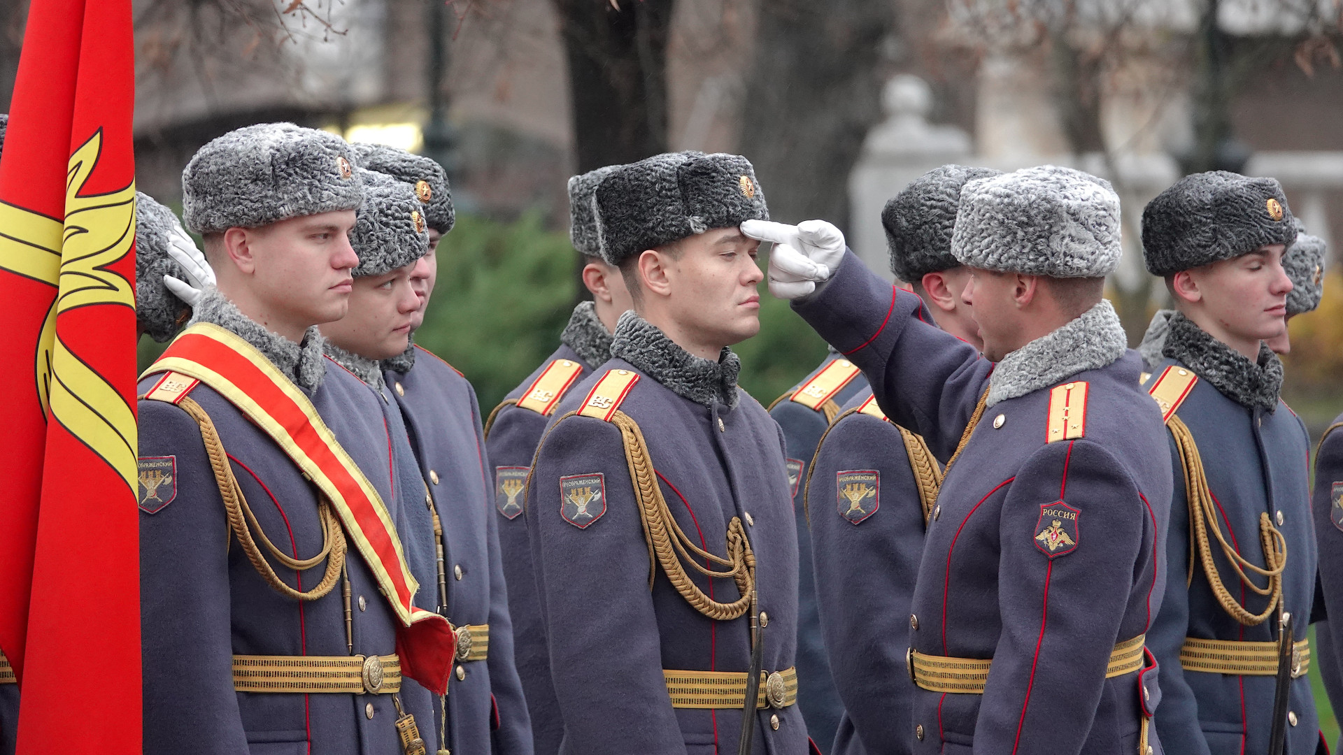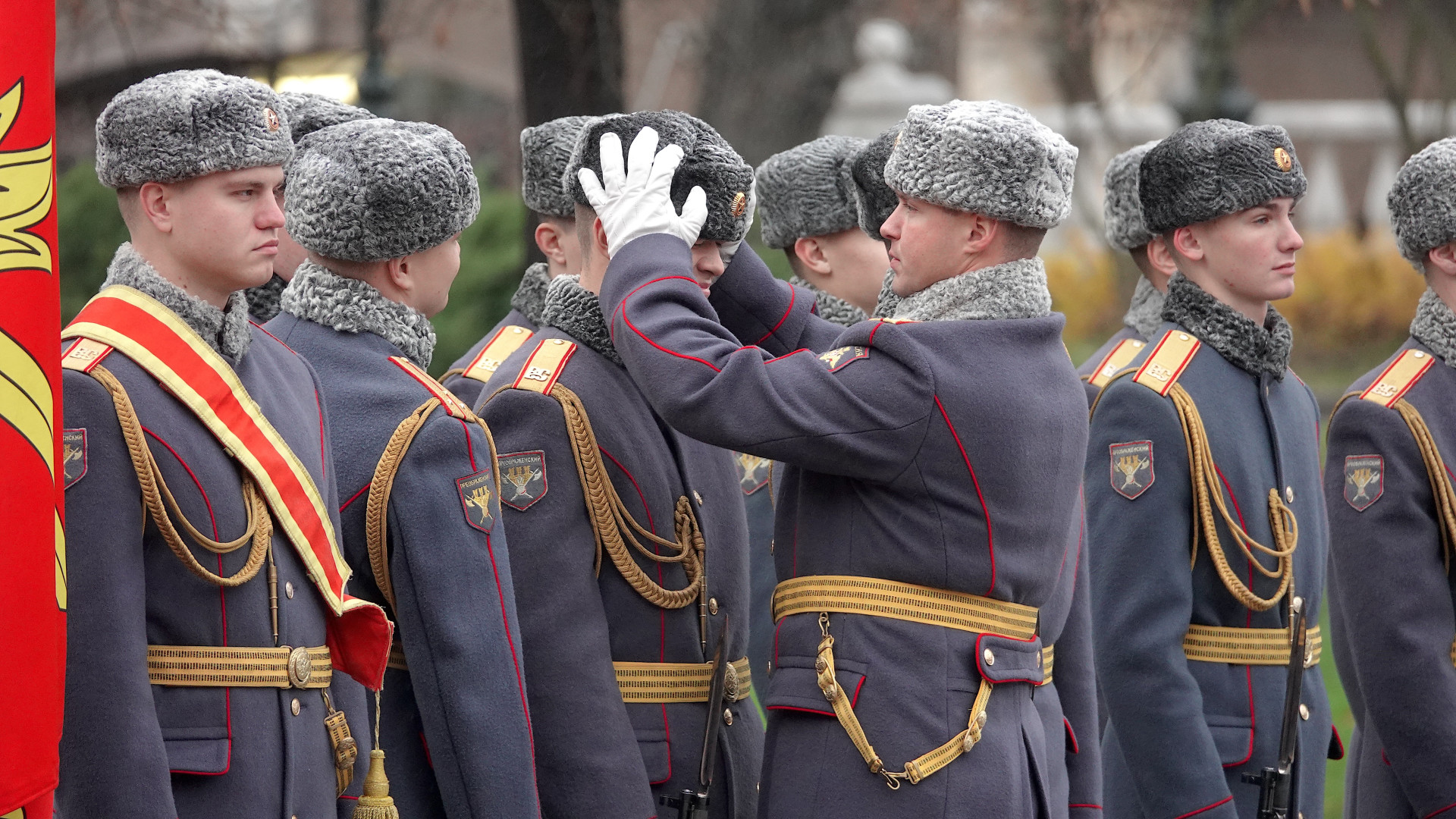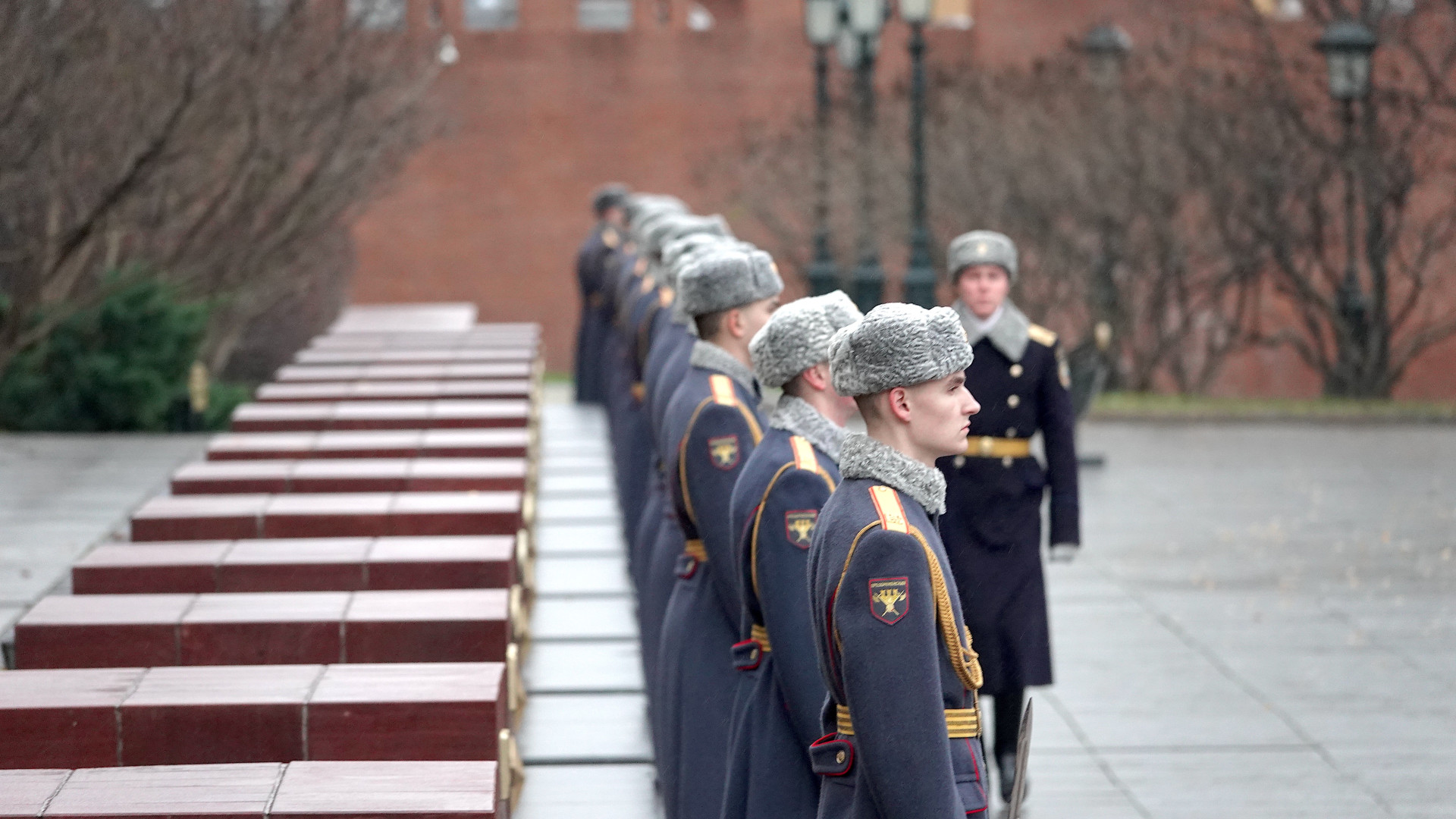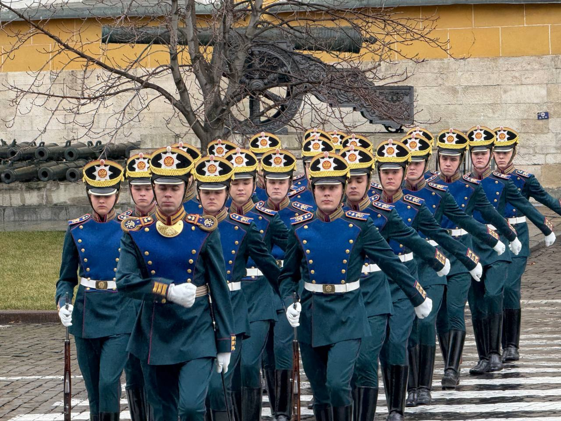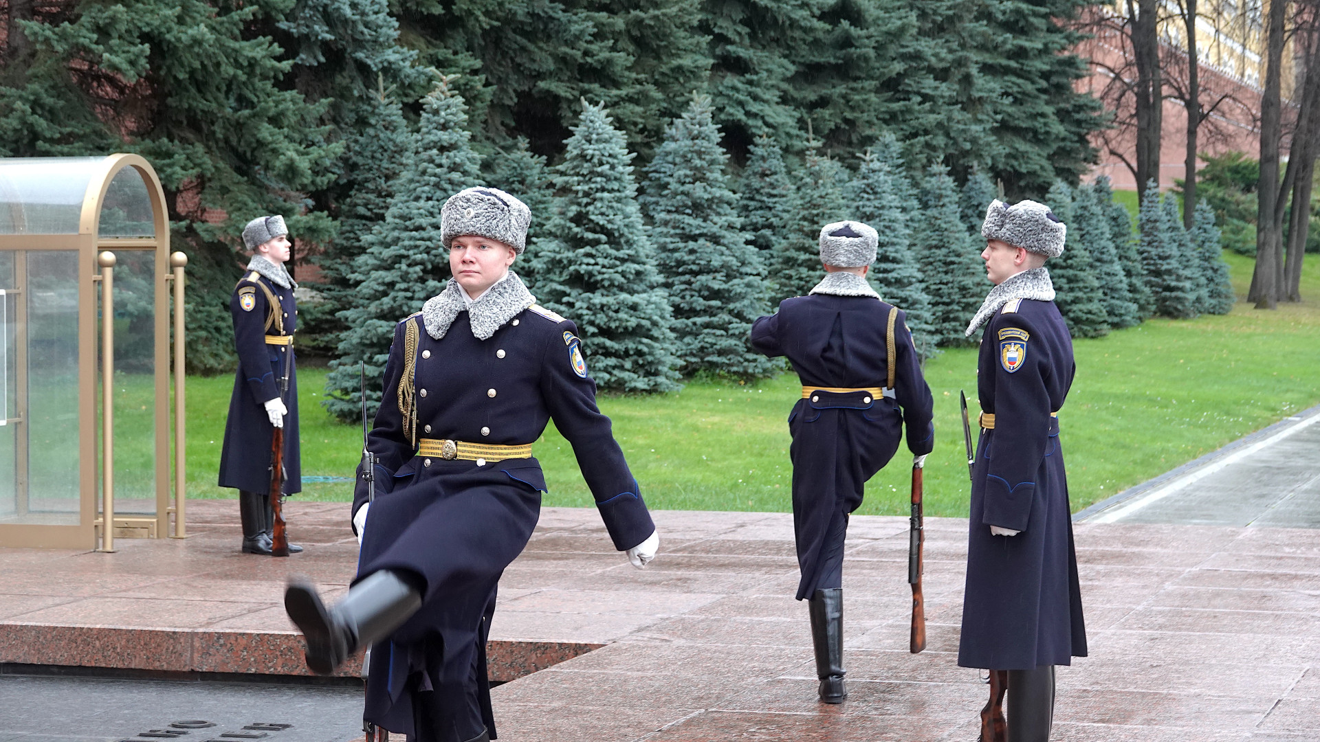 В Александровском саду всё выверено до секунды. Торжественную часть сопровождает та же рота почётного караула, что и накануне, судя по надписи на тубе, образцовая.