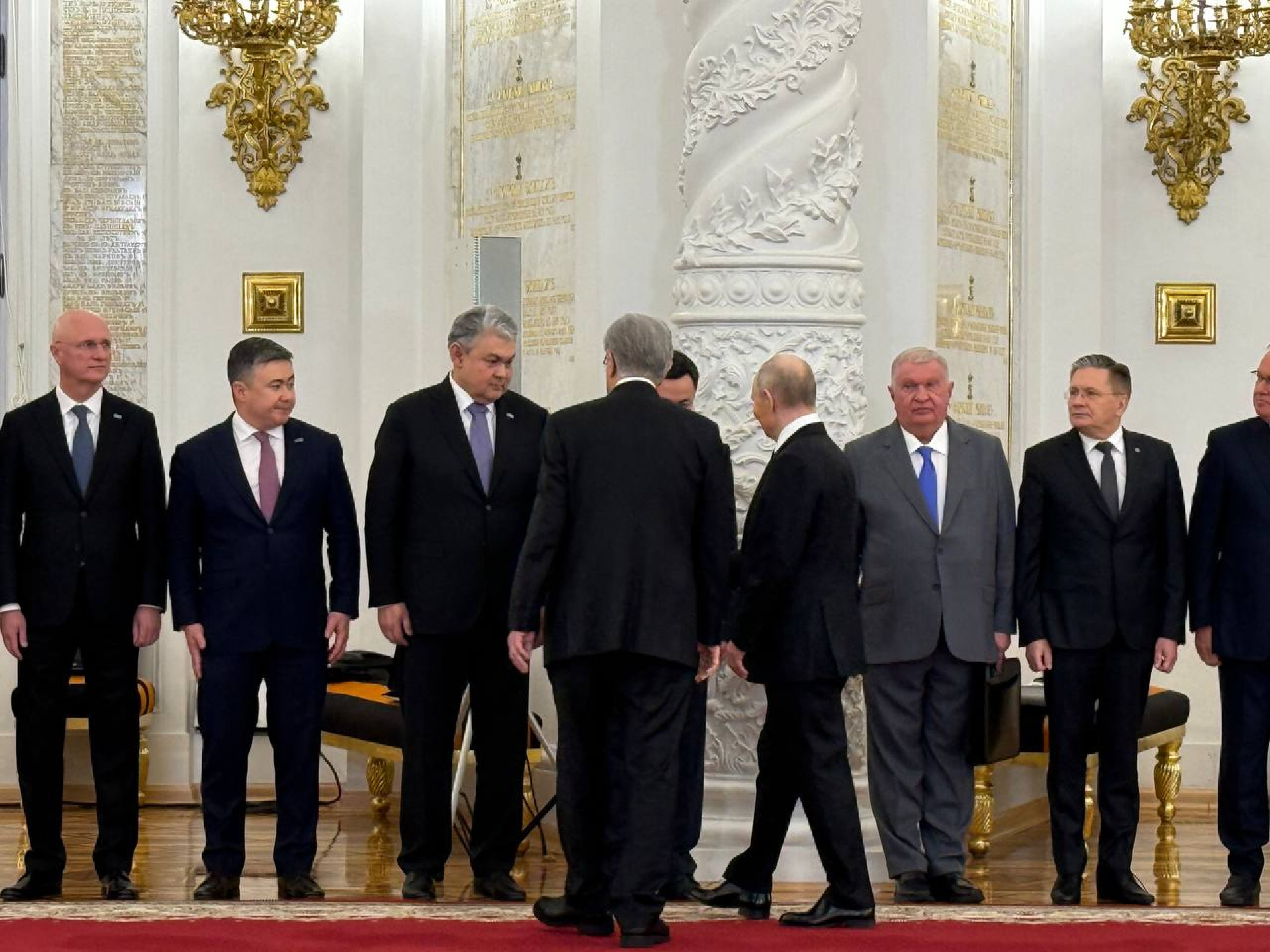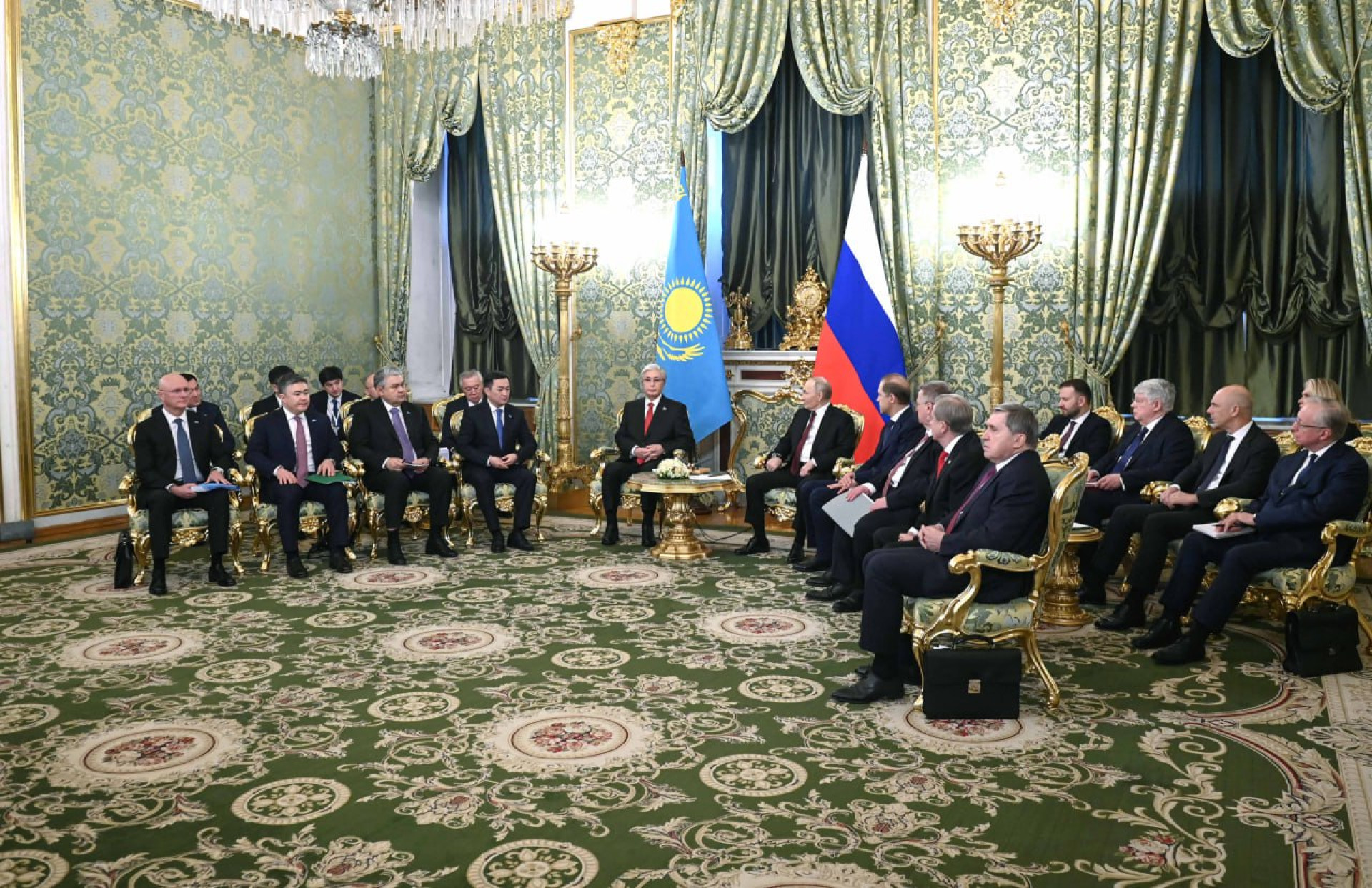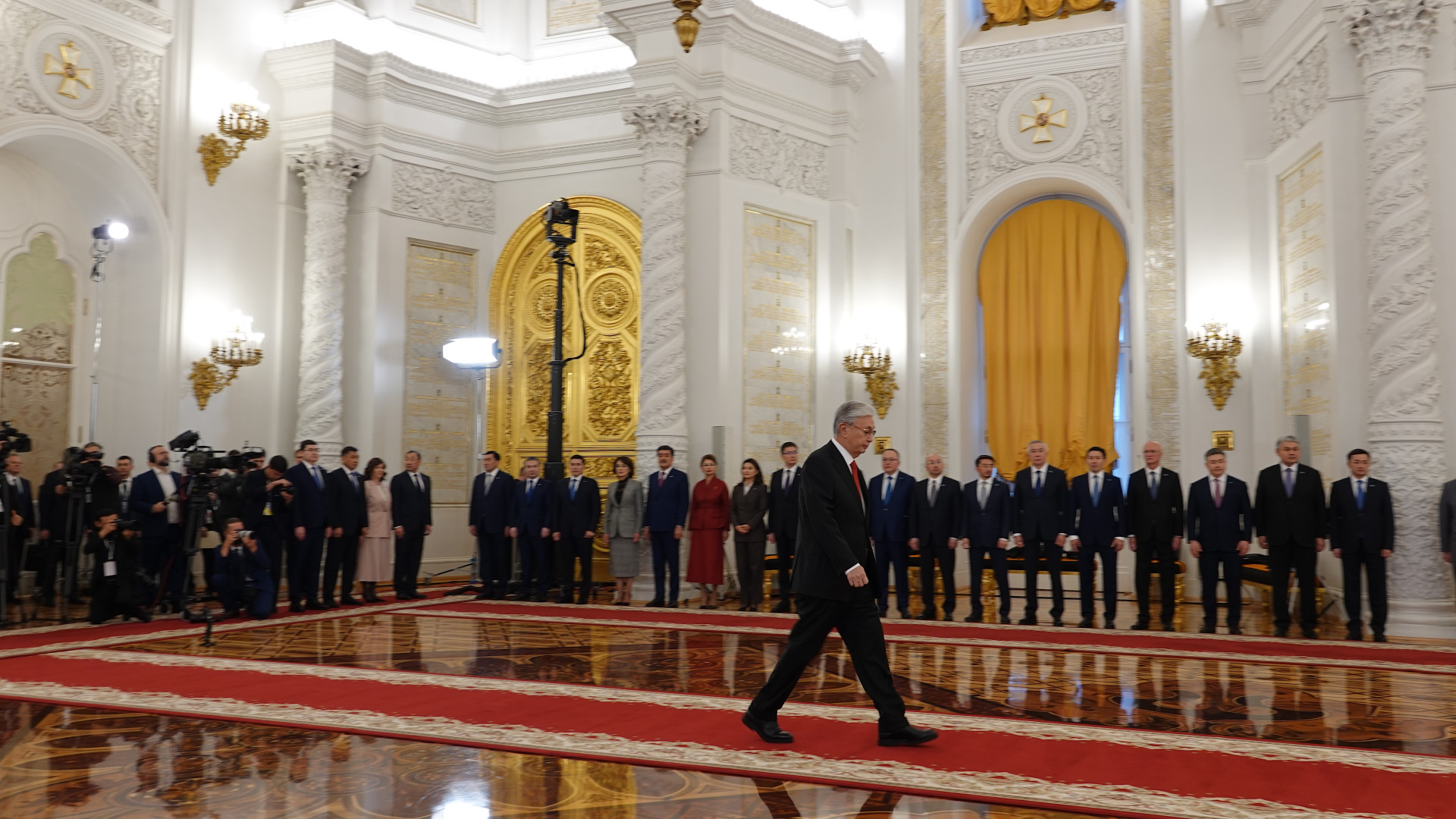 Касым-Жомарт Токаев открывает встречу — благодарит российскую сторону за приём и отмечает, что визит "продуман до мельчайших деталей". Он говорит спокойно, но уверенно: подчёркивает стратегический характер партнёрства и то, что "нет ни одной сферы, где бы Казахстан и Россия не работали вместе".