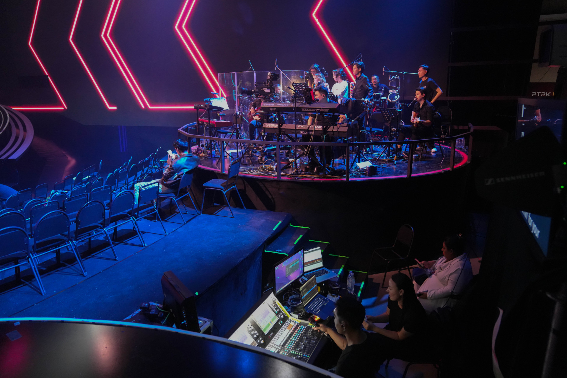 К примеру, на этой фотографии видно расположение аккомпанирующих музыкантов - надо подчеркнуть, что на Silk Way Star только живой звук, и артистам помогает целый оркестр.