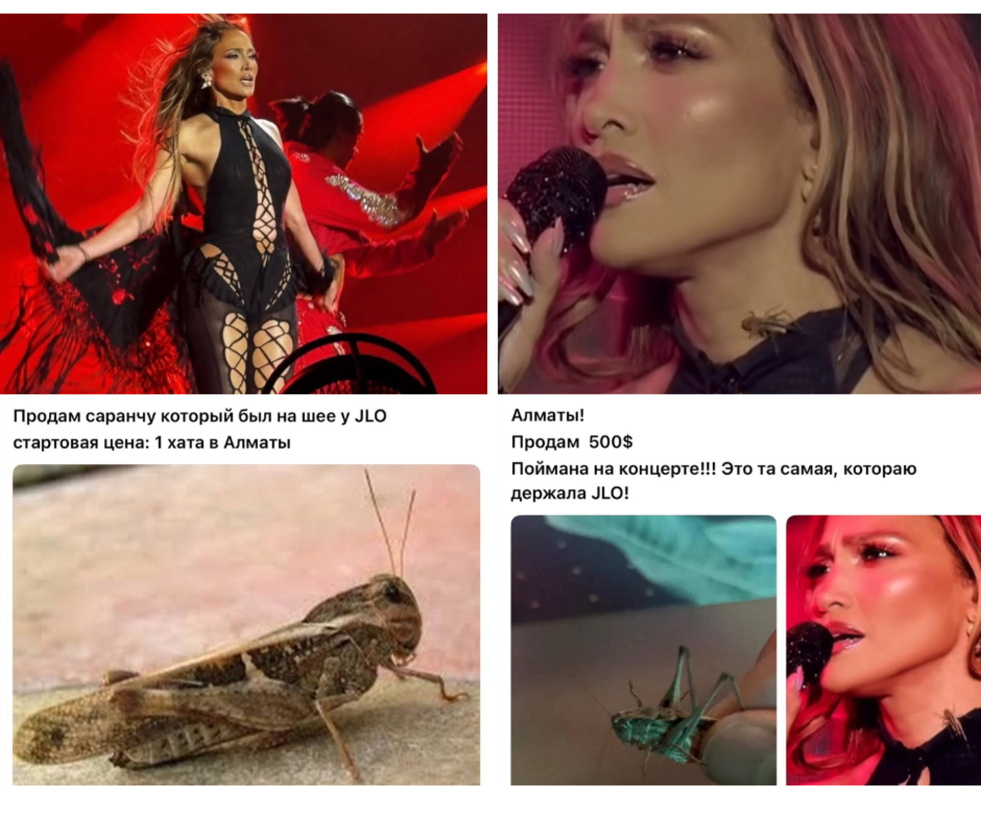 Кузнечик. Но самое удивительное, если вы помните, что после концерта Джей Ло слово "кузнечик" неожиданно вошло в повседневный словарь казахстанцев и держалось там какое-то время. Во время одного из номеров насекомое забралось по платью артистки к её шее. Лопес, не сбившись с ритма и продолжая петь, спокойно сняла кузнечика и отбросила его в сторону.