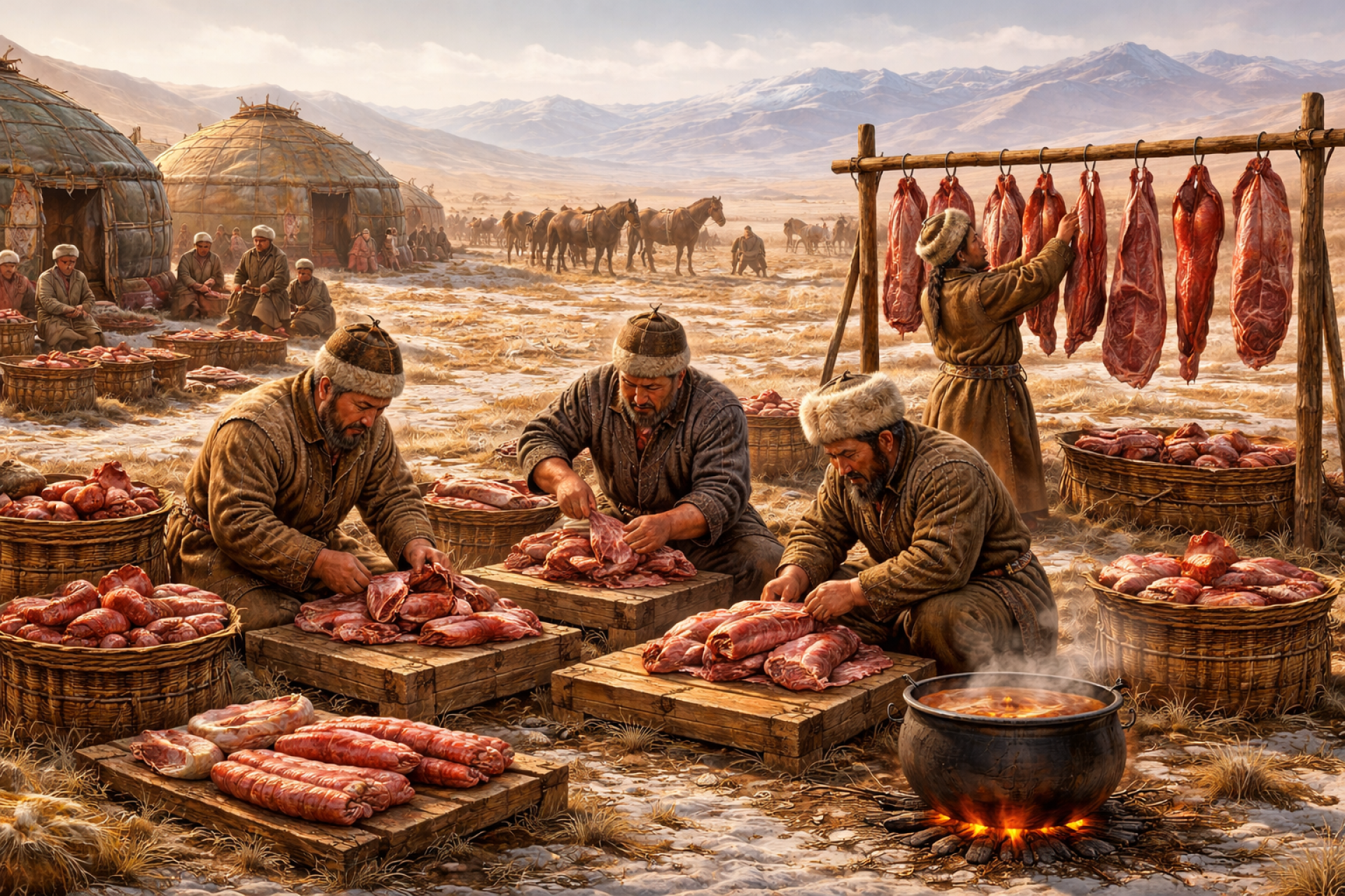 Зимняя заготовка мяса предполагает его длительное хранение. Способ консервации у кочевников — это уникальный опыт. Были разные виды: сушение, вяление, соление. Также применялся такой метод, как копчение. Для этого использовали красную таволгу, мясо коптили в специальных помещениях — курильнях.