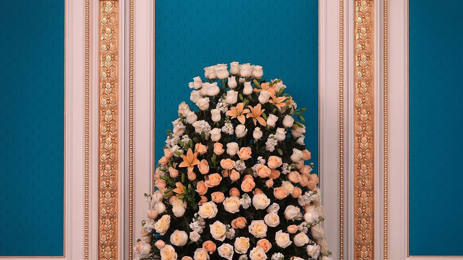 В соседнем зале, полном симметрии и выверенных цветочных пирамид, пространство словно само выстраивается в ожидании следующего кадра.