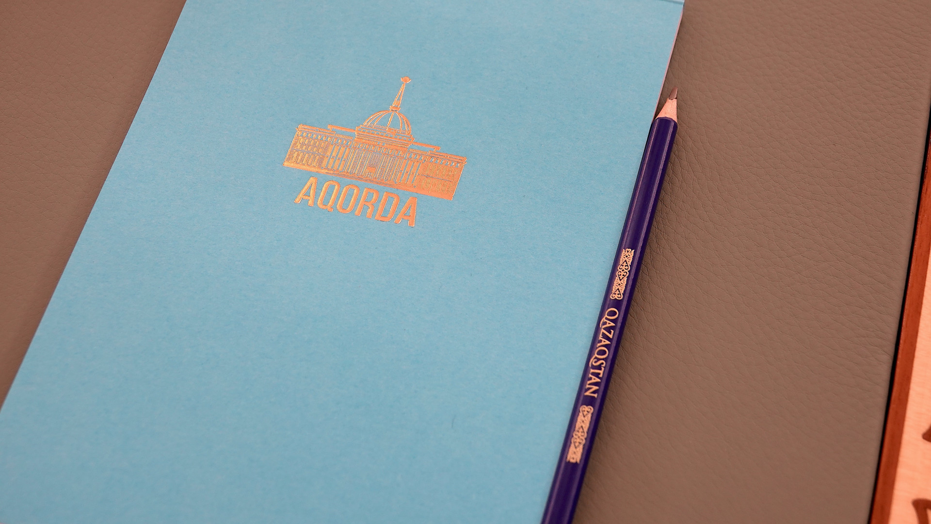 На отполированном до блеска столе переговоров по обе стороны лежат небесно-голубые блокноты и аккуратно заточенные карандаши с орнаментом и надписью Qazaqstan.