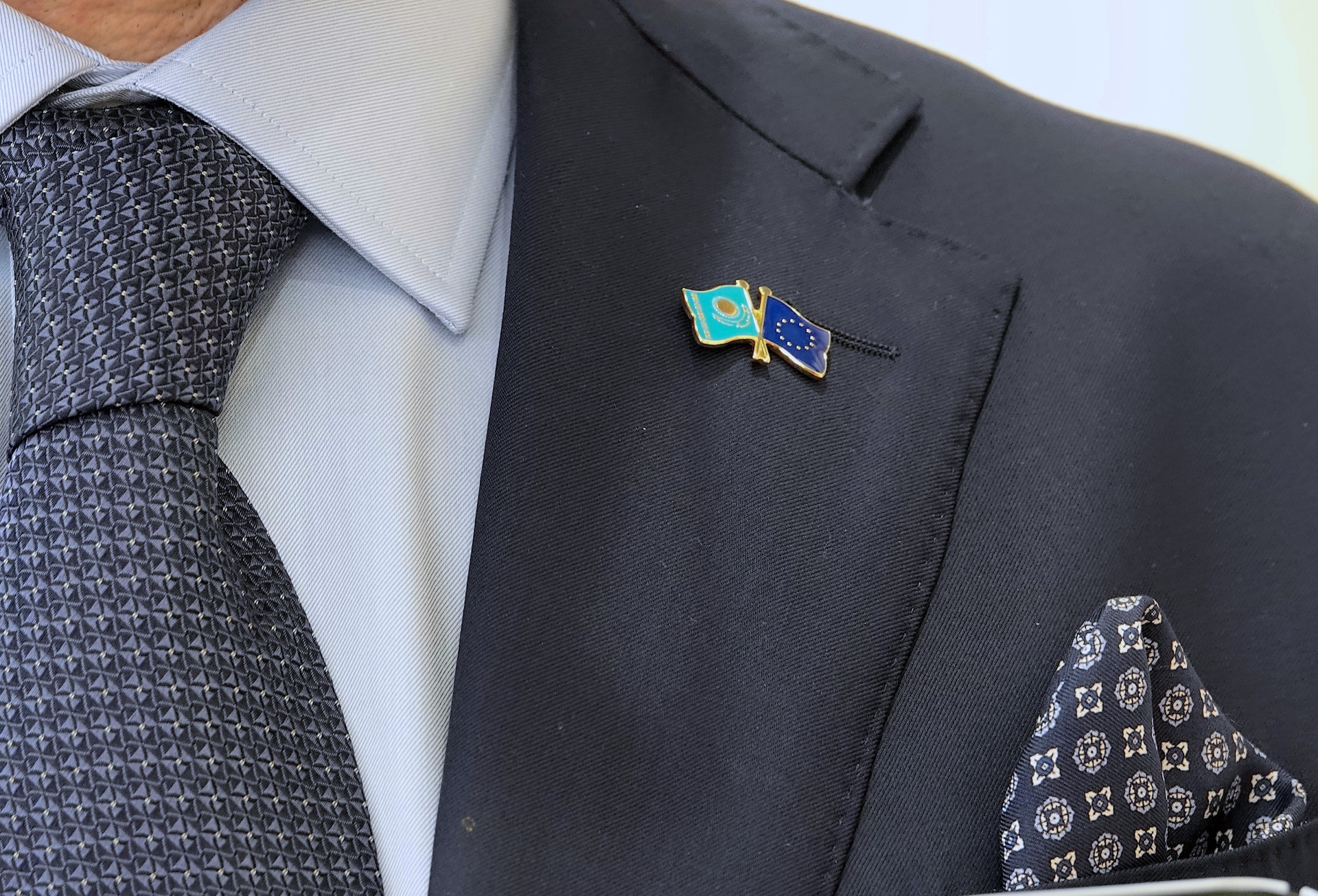 На лацкане он теперь носит значок с двумя флагами, Казахстана и ЕС. В нагрудном кармане — аккуратный платок-паше, рифмующийся с галстуком. Пиджак — тоже глубокого чернильного оттенка.