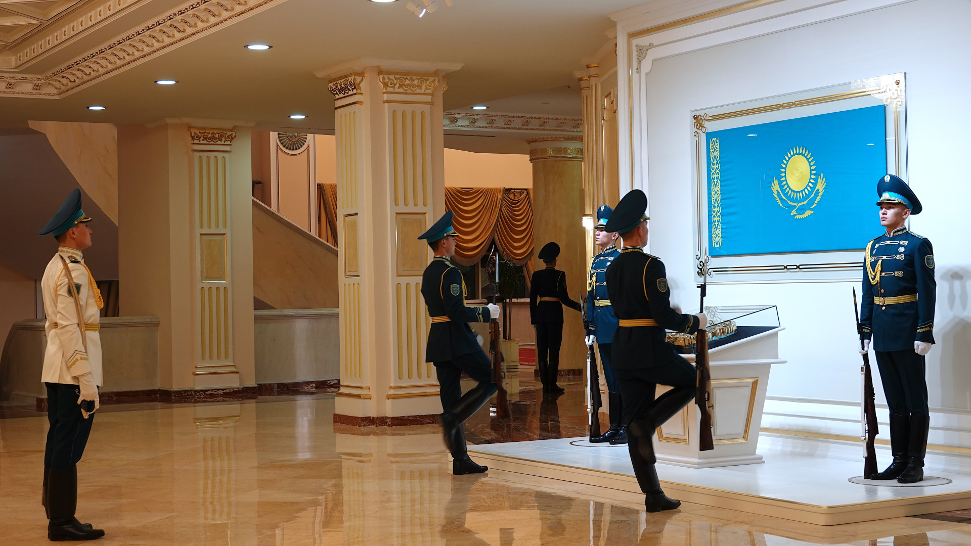 Переговоры продолжаются уже без прессы, а в коридоре тем временем происходит своя маленькая церемония — смена караула, который стоит на страже герба и флага. Процесс идёт очень тихо, почти беззвучно, но с таким усердием, будто и он тоже часть большого дипломатического ритуала.