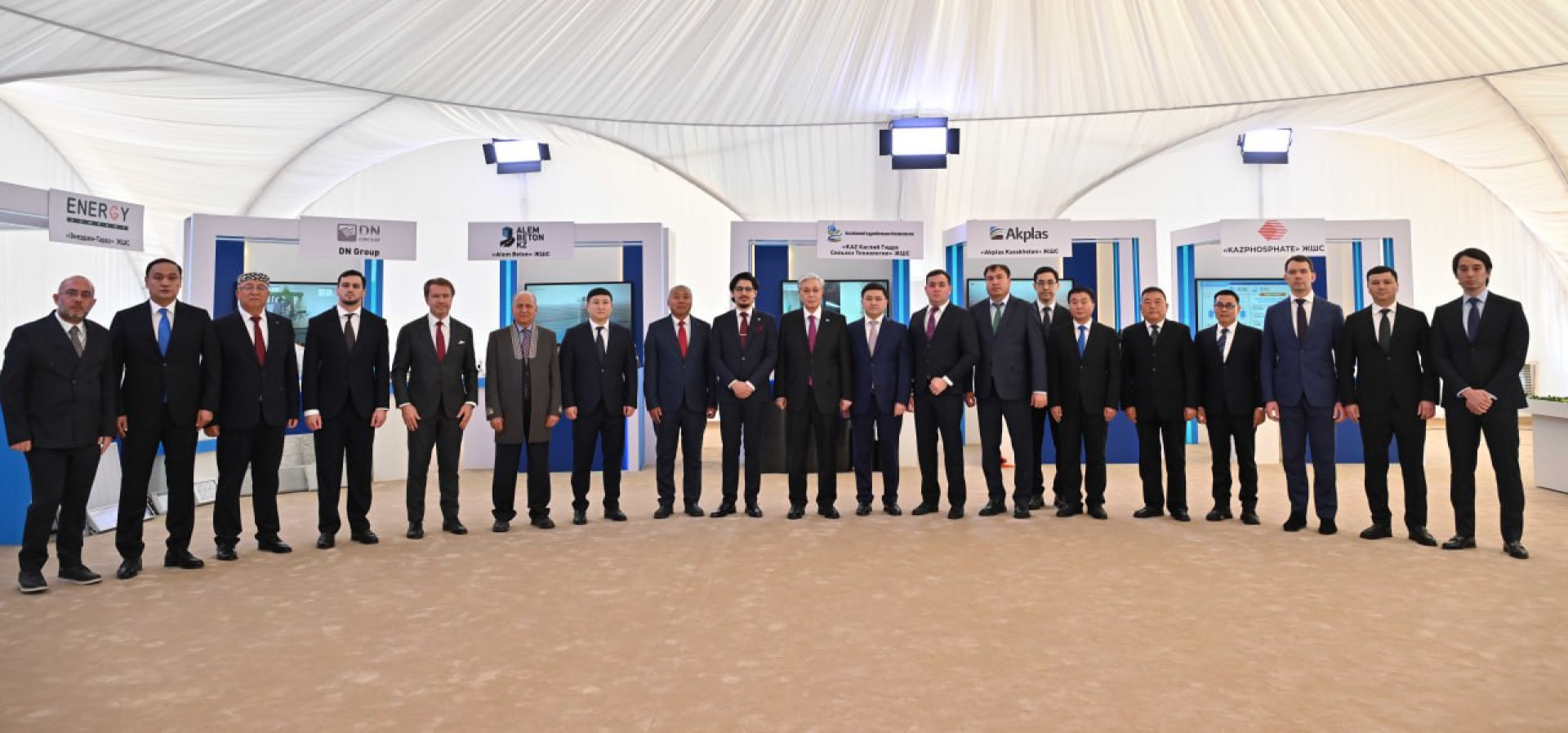 Токаеву докладывают: в регион привлекли почти 600 миллиардов тенге. Президент проходит вдоль стендов, останавливается, задаёт вопросы.