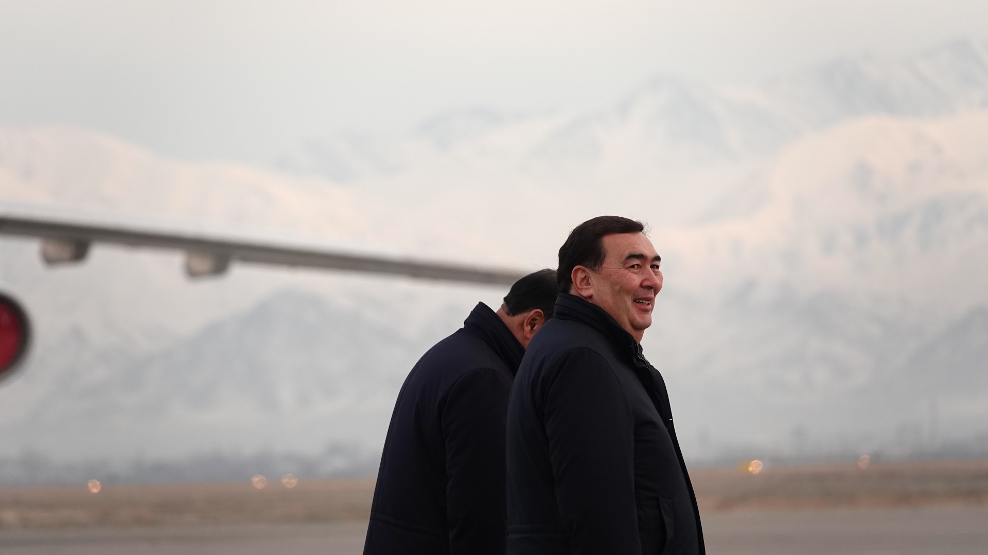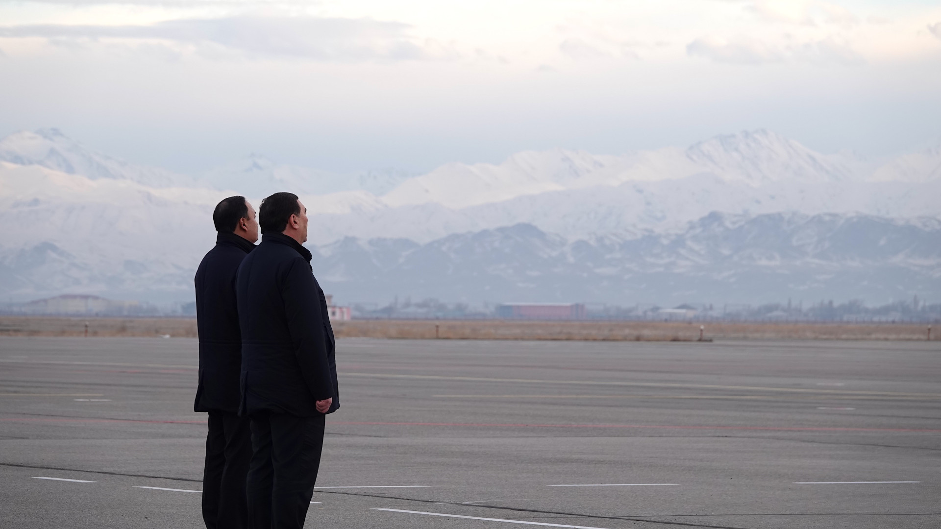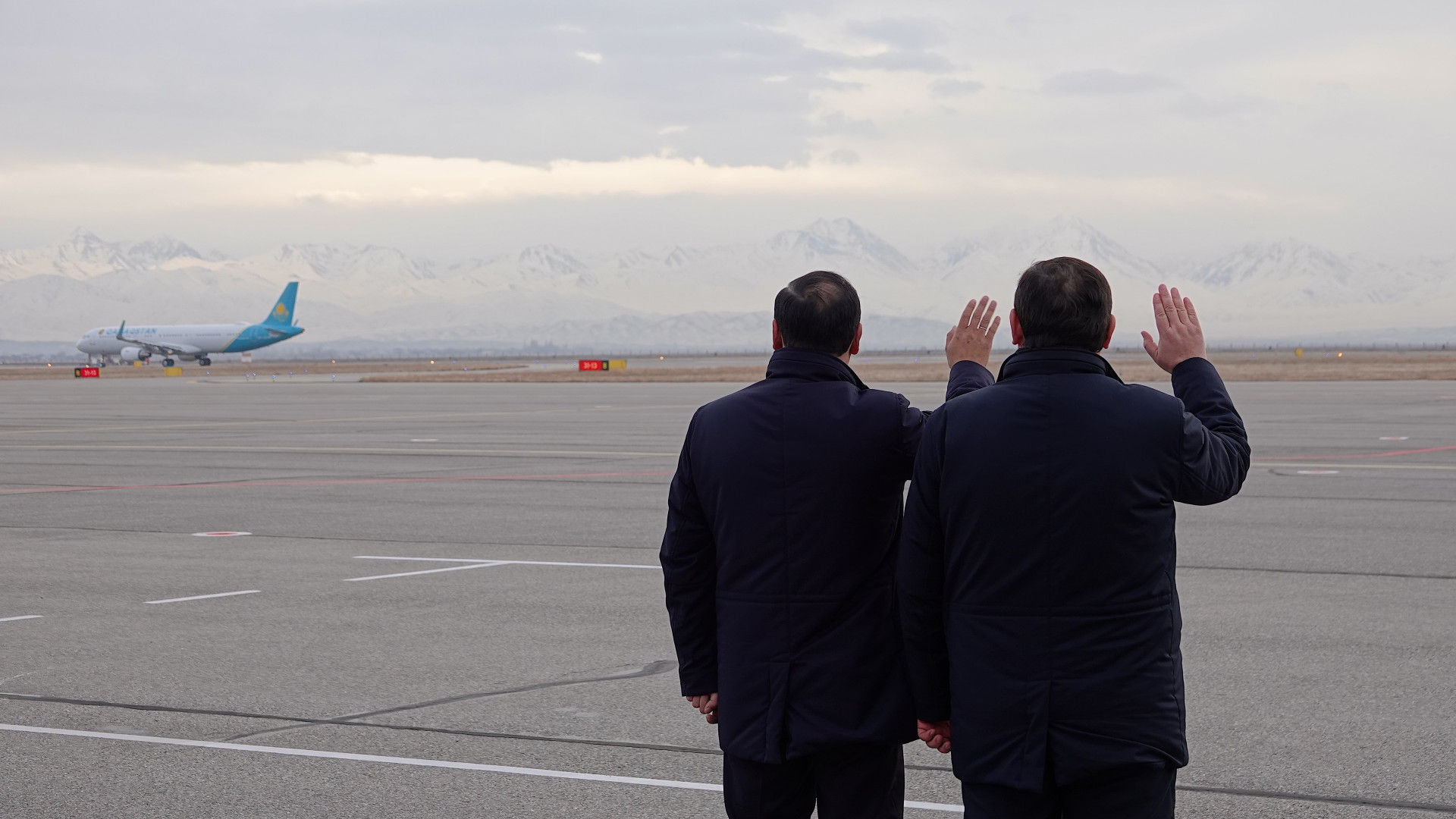 На лётном поле акимы провожают президентский борт. Стоят смирно. Перед ними — заснеженные горы и самолёт, который разворачивается на взлёт.