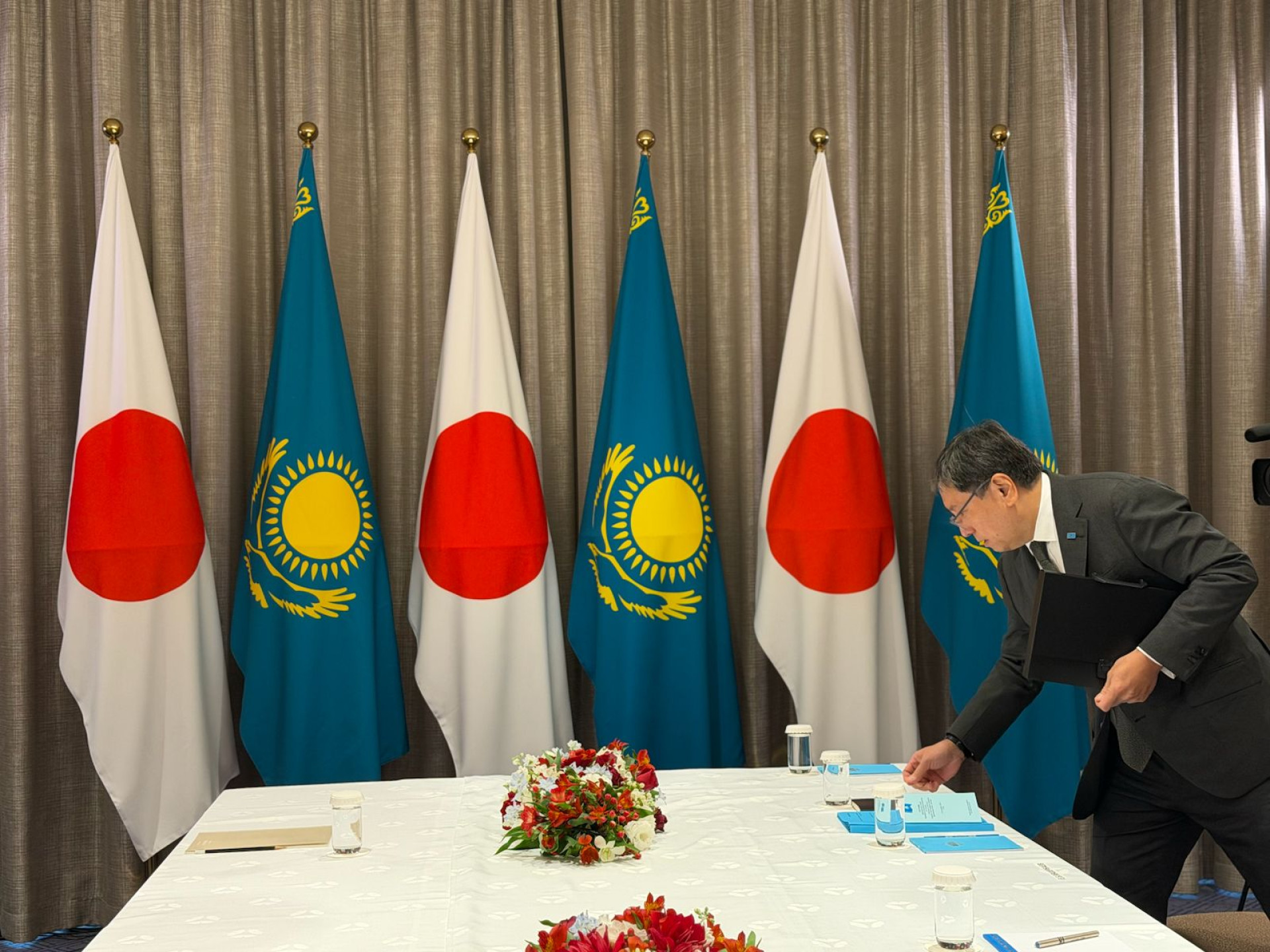 Пока казахстанская делегация ещё в пути, за столом уже наводят порядок. Заместитель руководителя Администрации Президента Ерболат Досаев аккуратно выравнивает документы. Тут тоже всё должно быть по протоколу.