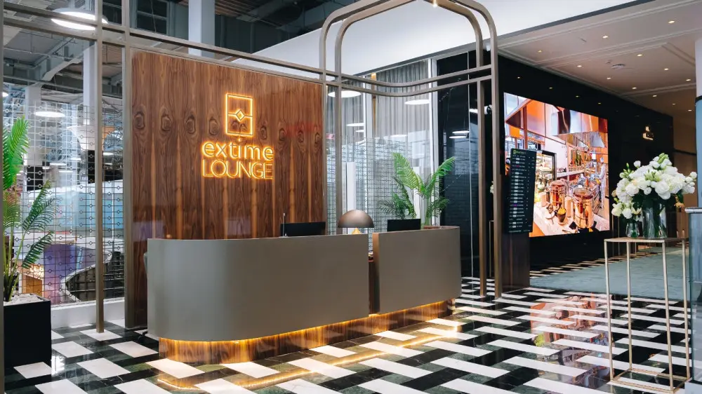 Залы Extime Lounge были специально спроектированы, чтобы обеспечить непревзойденный уровень обслуживания пассажиров, предлагая как бизнес-зал, так и зал для VIP-клиентов, общей площадью около 1 160 квадратных метров. Здесь путешественники смогут воспользоваться уникальными условиями для отдыха и работы. Интерьер лаунжа оформлен в элегантном современном стиле, сочетающем элементы роскоши и комфорта.