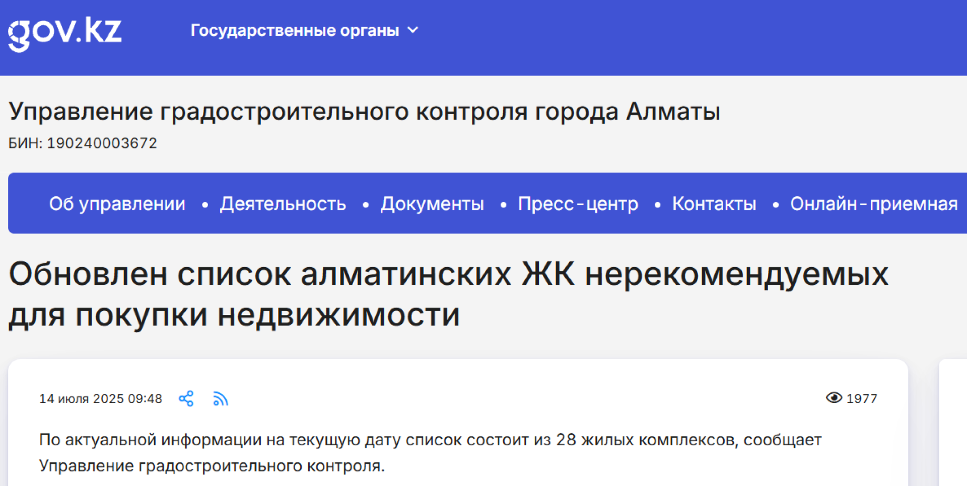Контроль за соблюдением правил усилят акиматы и профильные ведомства, которым теперь разрешено проверять рекламу жилых комплексов и блокировать незаконное привлечение средств. Кстати, госадминистрации практикуют публикацию списков ЖК, не рекомендуемых для покупки. Например, такой есть в Алматы, но последний раз он обновлялся 14 июля 2025 года: