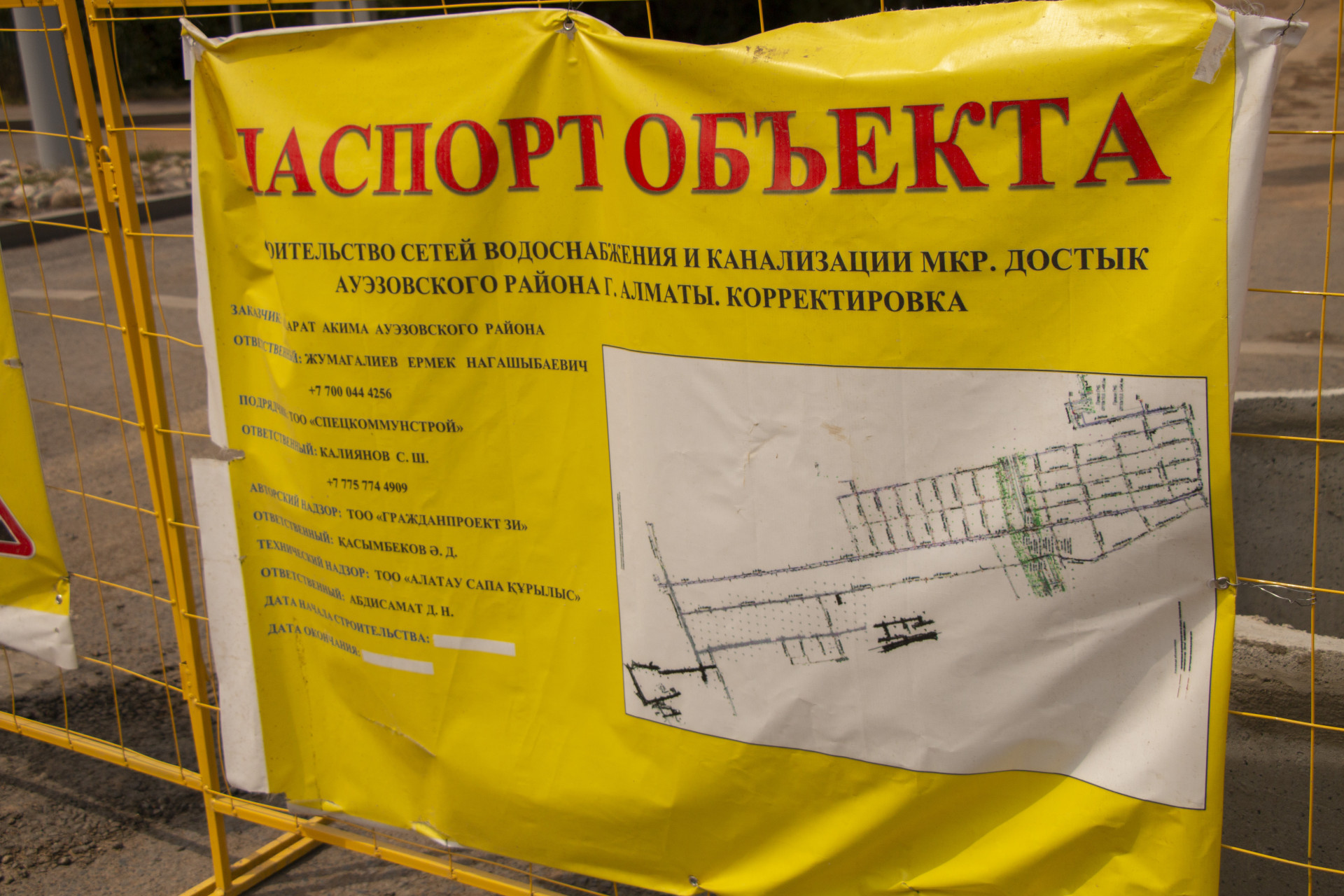 А начались работы на улице Яссауи 10 июля. Заказчиком строительства "сетей водоснабжения и канализации" выступал всё тот же аппарат акима Ауэзовского района. В паспорте объекта, который тогда снял наш корреспондент, подрядчиком значилась уже знакомая нам компания "СПЕЦКОММУНСТРОЙ".