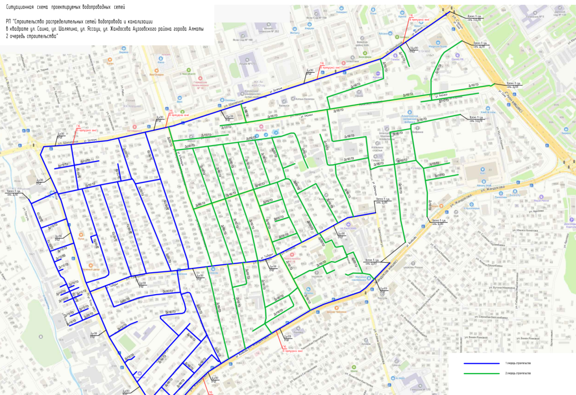 В документации даже можно найти карту проекта. Синим цветом отмечены улицы, которые обустраивала компания "ДАНиЕР", а зелёным — те, что "Спецстрой Групп ЛТД". Среди них — хоть и маленькая, но ставшая известной улица Аманжол.