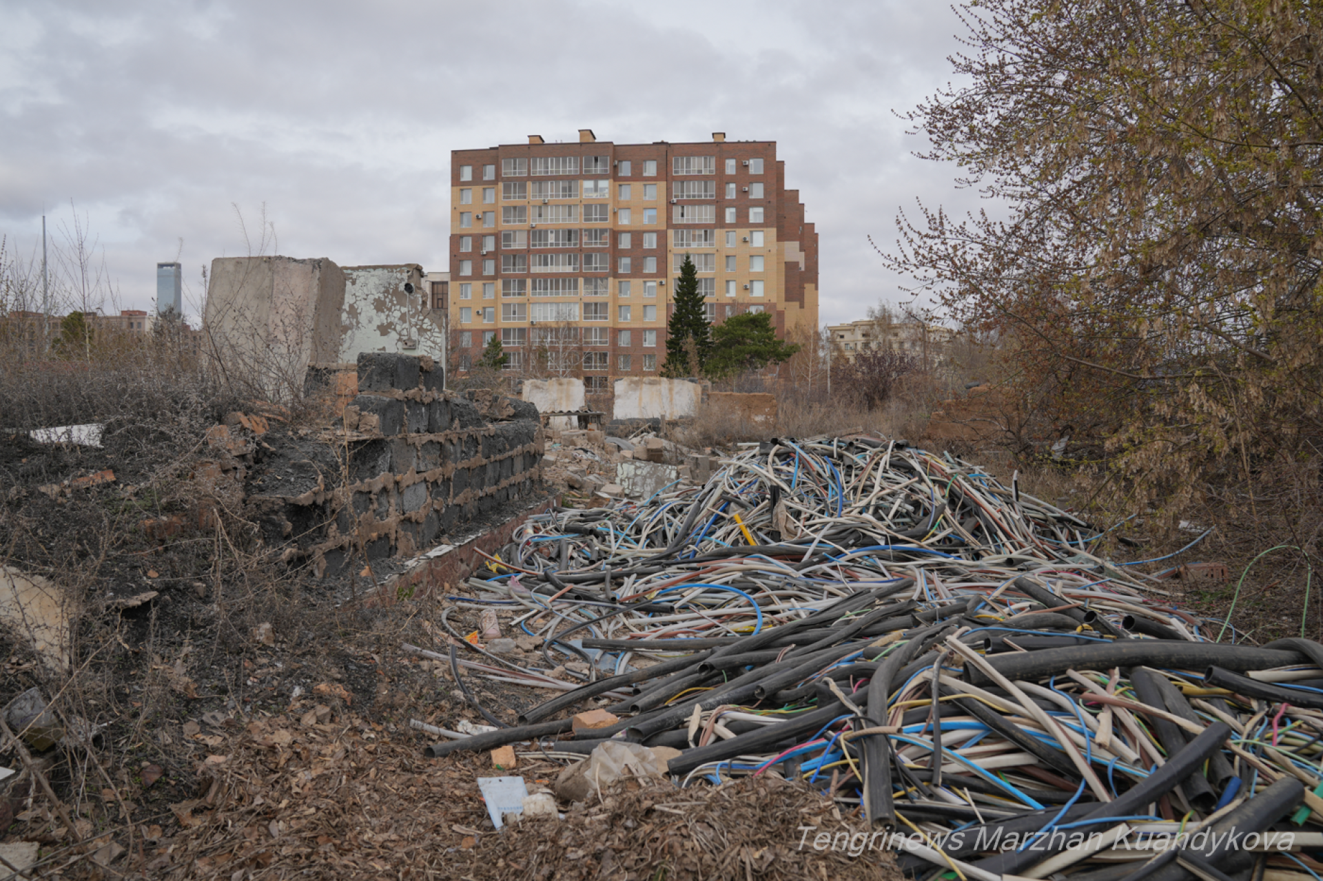 По пути на встречу с ещё остающейся здесь местной жительницей мы заглядываем в другие дворы. В них дома уже наполовину снесены. Вокруг — груды кирпича, обломки стен и целая гора из защитной оплётки проводов.