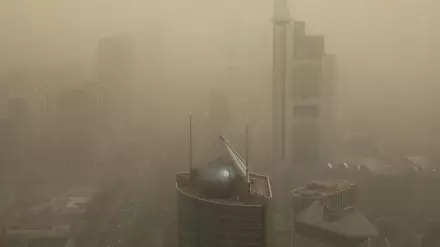 Небоскребы скрыты густой коричневой дымкой, видимость в городе не превышает 1000 метров.