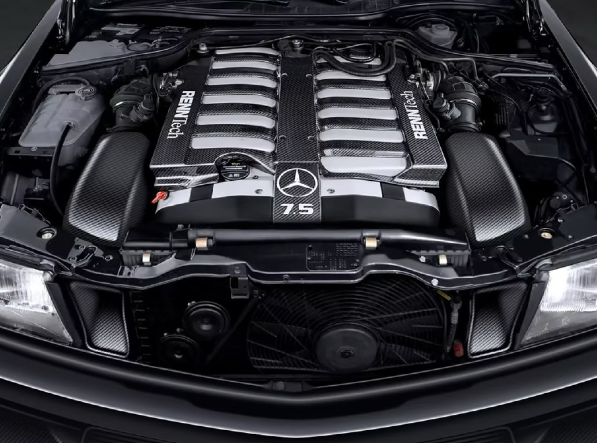 Этот двигатель — один из самых редких и значимых моторов Mercedes. Их устанавливали в такие авто, как Pagani Zonda и гоночный Mercedes CLK GTR, побеждавший в Ле-Мане. Renntech увеличила рабочий объём до 7,5 литра, сохранив при этом полностью алюминиевую конструкцию, выпускные коллекторы и атмосферную схему без турбин и гибридов.