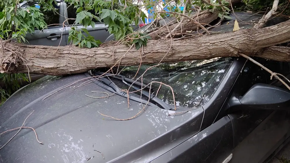 Многолетнее дерево упало на оживленную аллею и повредило несколько припаркованных автомобилей в Костанае, передает Tengrinews.kz со ссылкой на "Алау".